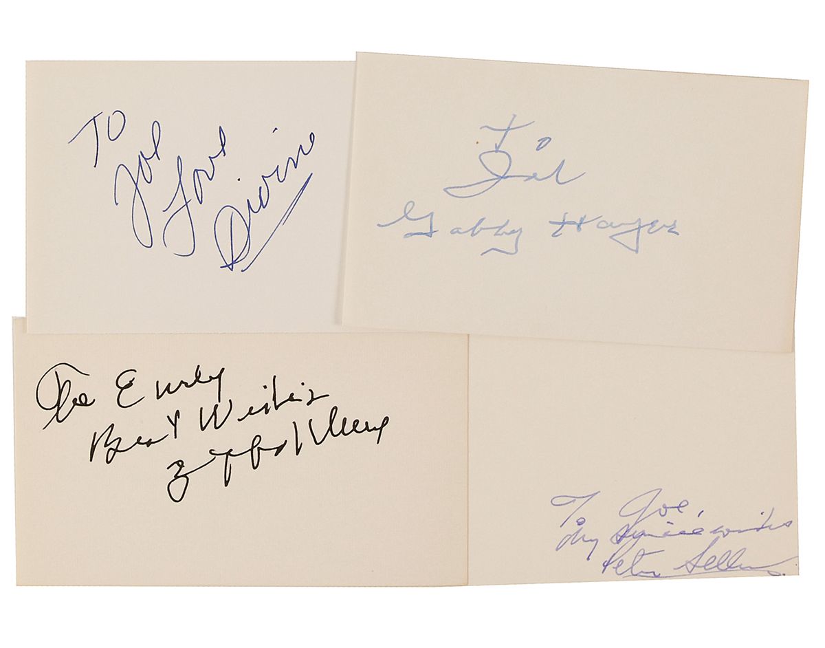 Four ink and felt tip signatures on 5 x 3 cards, each signed and inscribed by a different character actor. Signers are: Divine, Gabby Hayes, Zeppo Marx, and Peter Sellers. In fine condition.