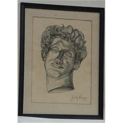 A framed drawing of a young man with curly hair. Black oak frame, signed Judy Kemper, 5/64.