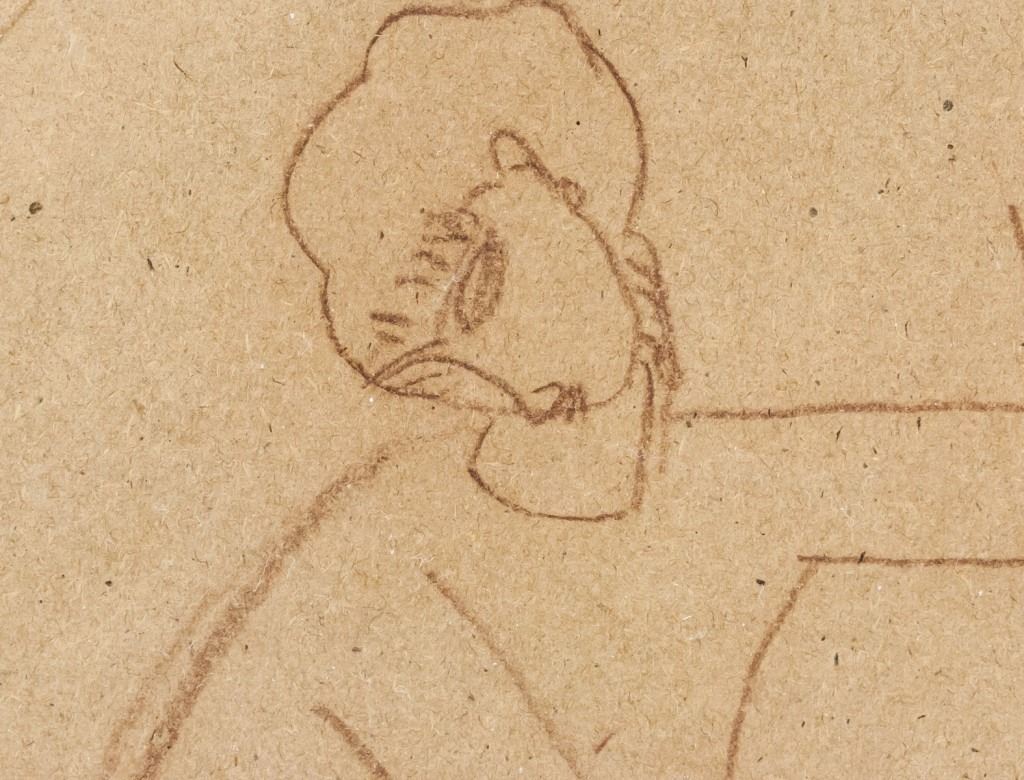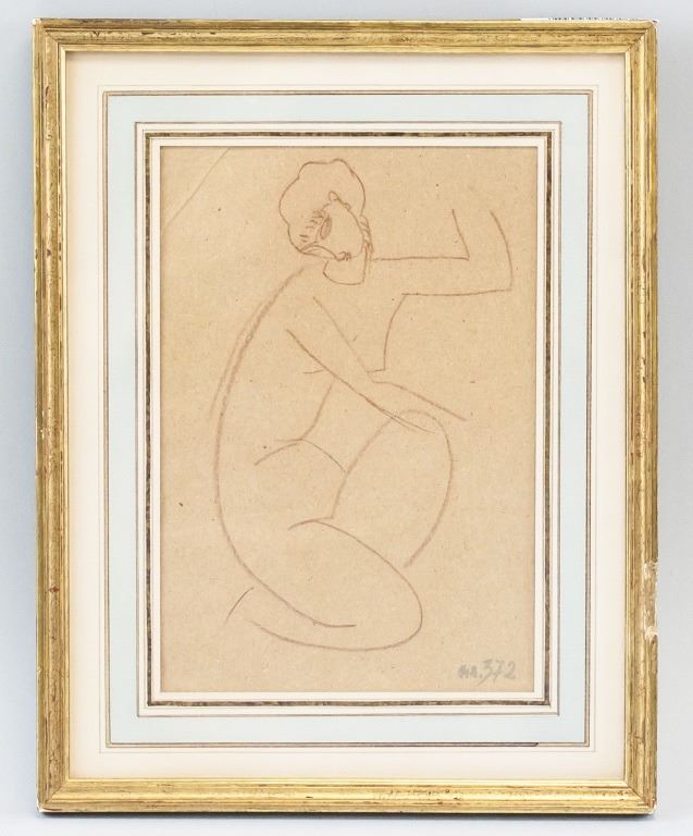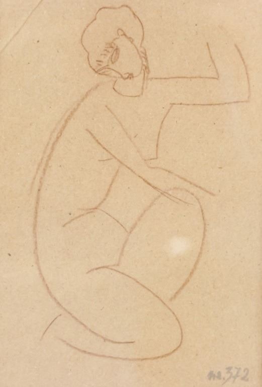 Charcoal on paper, framed. Featuring portrait in the style of Amedeo Modigliani. Unsigned. "no. 372" inscribed to the bottom right. Illegible stamp on verso. 17 x 12 cm (7 x 4.75 inch), framed size: 26 x 20 cm (10 x 8 inch).
