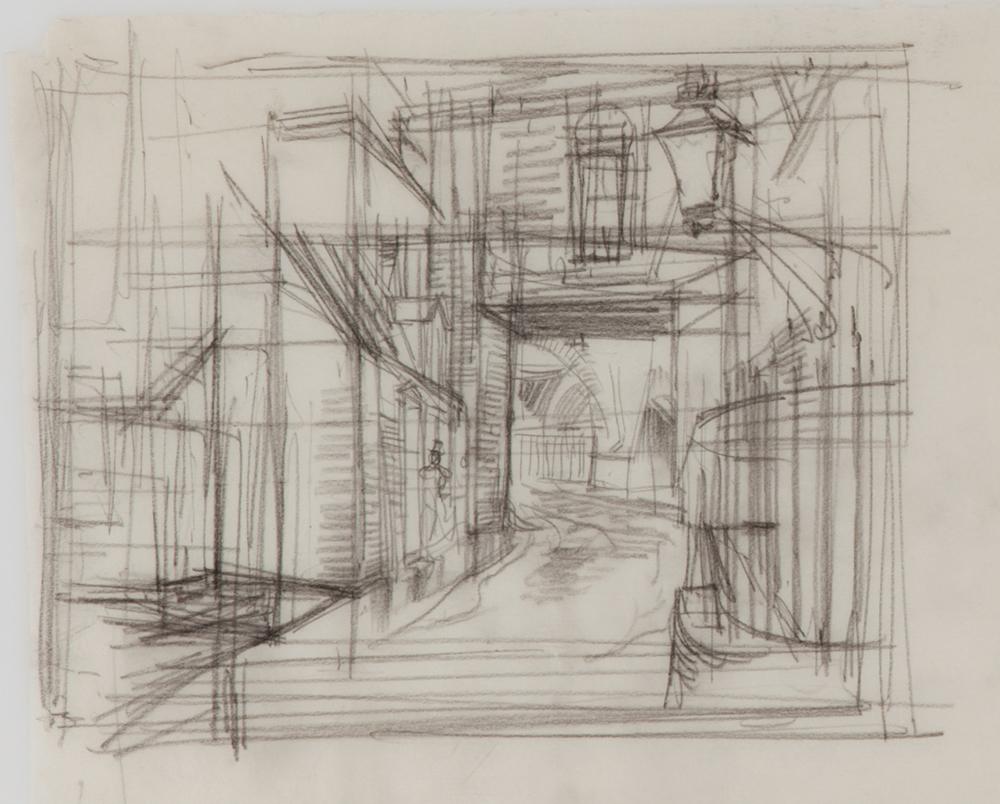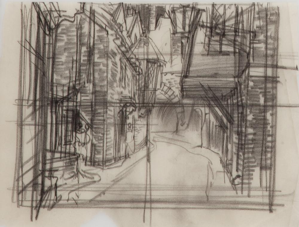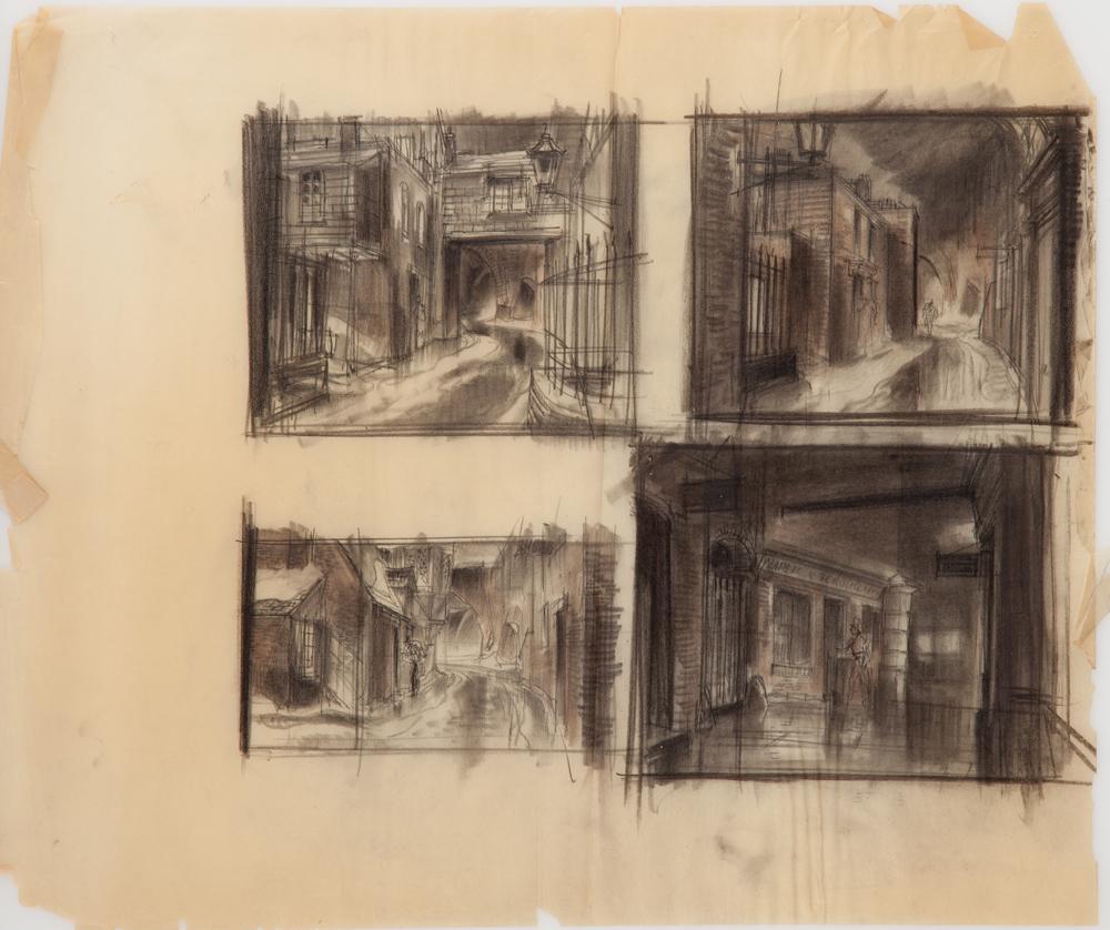 (MGM, 1938) Lot consists of six charcoal production drawings of set designs, including home of Bob Cratchit, office of Marley and Scrooge, and other buildings; four to one sheet, two separate.