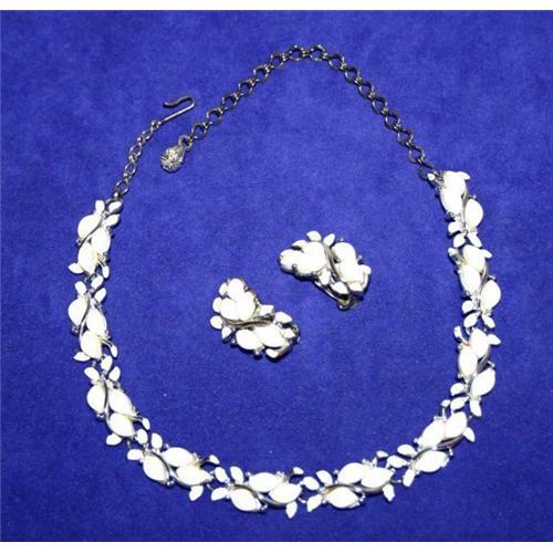 Produced by the Charel Jewelry Company in the 1950s this is a fabulous Summer White Necklace and Earrings Set. Beautiful white Thermoset flowers highlighted with white enameled leaves set in a Rhodium plated metal, measuring16 inch long and ½ of an inch wide. The matching Earrings repeat the same pattern as the Necklace measuring 1 ¼ inches long by 5/8 of an inch wide, securing with a clip-back closure. All three pieces in this vintage jewelry set are signed Charel. Imagine wearing this fabulous jewelry set with a crisp white linen shirt! YUM!