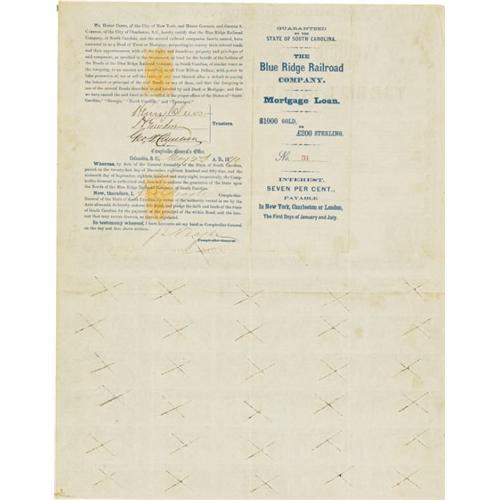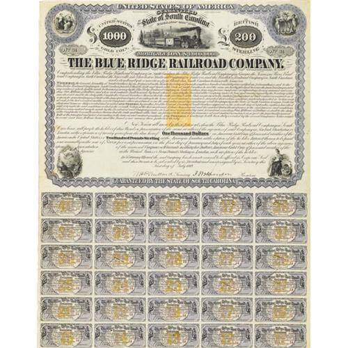 <B>Charleston, SC- Blue Ridge Railroad Company</B></I> $1000 Gold Bond July 1, 1869<BR> This bond is also denominated in £200 Sterling. Coupons 11 through 34 remain and their coupon numbers have been emblazoned on them with a "golden-like" ink. Revenue imprints are also on the bond. The bond and the coupons have been cut cancelled. <B>Very Fine</B></I>, CC<B>.</B></I> <BR><BR><b>Shipping:</b> Coins & Currency (<a target="_blank" href="http://www.heritageauctions.com/common/shipping.php">view shipping information</a>)