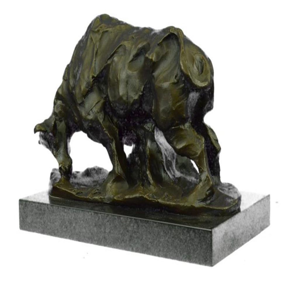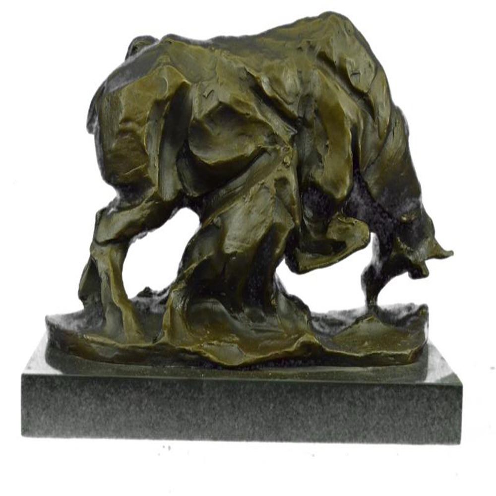 This magnificent modern and abstract Sculpture is of a charging bull. With his head down, his nostrils flared and his muscles tightened he rears up to stomp the ground before him, releasing a vibrating grunt, he makes his presence known. All he sees now is red and he is raging angry, his horns are sharp and solid and he prepares to charge his nemesis and take him down. He is an extremely muscular and dense creature, thick rolls of muscle curl around his neck for protection, he was made for these sorts of confrontations of physical strength. His tail curls up in a swift motion and off he goes, frozen in his pose and replicated in a true masterpiece of Bronze artwork. This modern and abstract piece is perfect for a modern-based theme. This Bronze Sculpture has a two-tone brown patina and is cast using the ancient Lost Wax Method and resting on a marble base. Dimensions: Height 9 X Width 12 inches. Weight: 20 LBS.