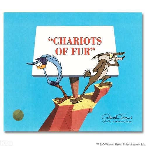 Own this amazing piece based on the original line image hand drawn and hand-inked on paper by Chuck Jones! "Chariots of Fur" is a limited edition animation cel from a sold out edition with hand painted coloring on sericel outline, numbered and hand signed by Chuck Jones (1912-2002). Includes Certificate of Authenticity! Measures approx. 12.5" x 10.5".