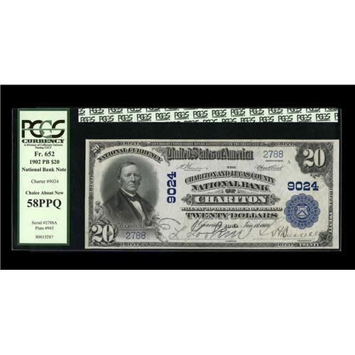 <B>Chariton, IA</B></I> - $20 1902 Plain Back Fr. 652 <B>The Chariton & Lucas County NB</B></I> Ch. # 9024<BR>An attractive example which appears to fully justify ist PCGS assigned grade of <B>Choice About New 58PPQ.</B></I>