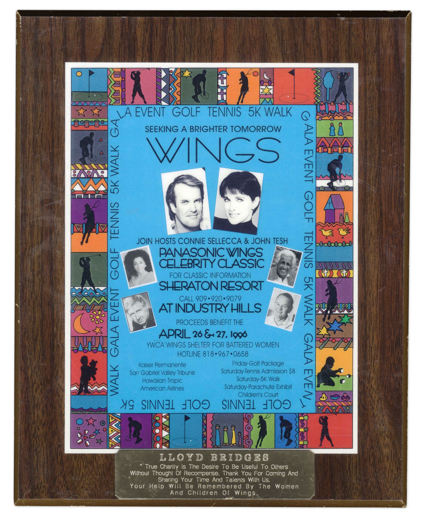 Glossy wooden plaque with colorful design awarded to actor Lloyd Bridges, who appeared in over 50 television shows and 125 films. Held on 26-27 April 1996, event at Sheraton Resort in Industry Hills included golf and tennis tournament, 5k walk and gala event benefiting Wings, a YWCA shelter for battered women. Raised metal plaque on bottom reads: ''LLOYD BRIDGES / True Charity Is the Desire To Be Useful To Others Without Thought Of Recompense. Thank You For Coming And Sharing Your Time And Talents With Us. Your Help Will Be Remembered By The Women And Children Of Wings''. Measures 10'' x 12'' and 0.5'' thick. Some scratching to glossy surface and edges. Overall very good condition. From the estate of Lloyd Bridges.