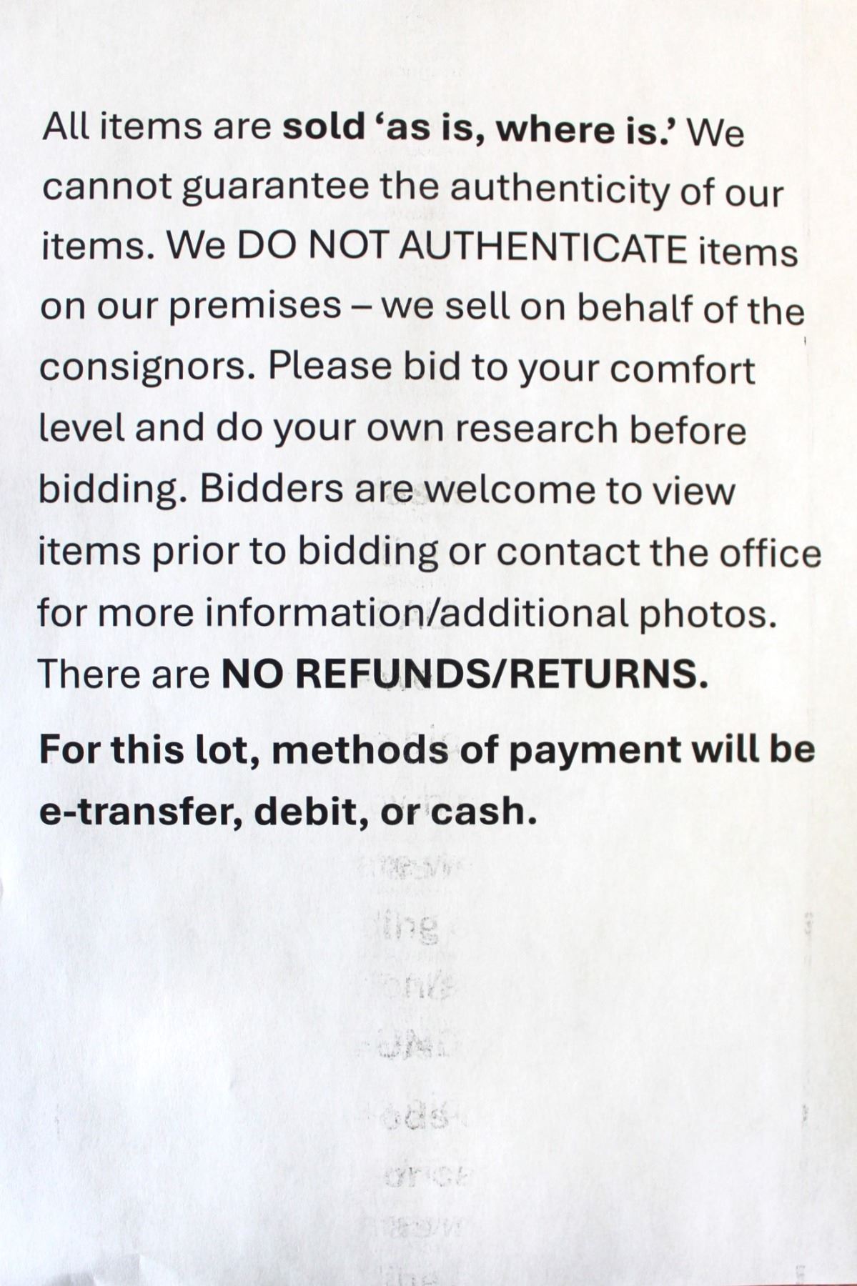 A online bidding premium may be applied to each lot purchased on the Internet. Federal GST and corresponding Provincial Sales Tax will apply to all purchases where applicable.