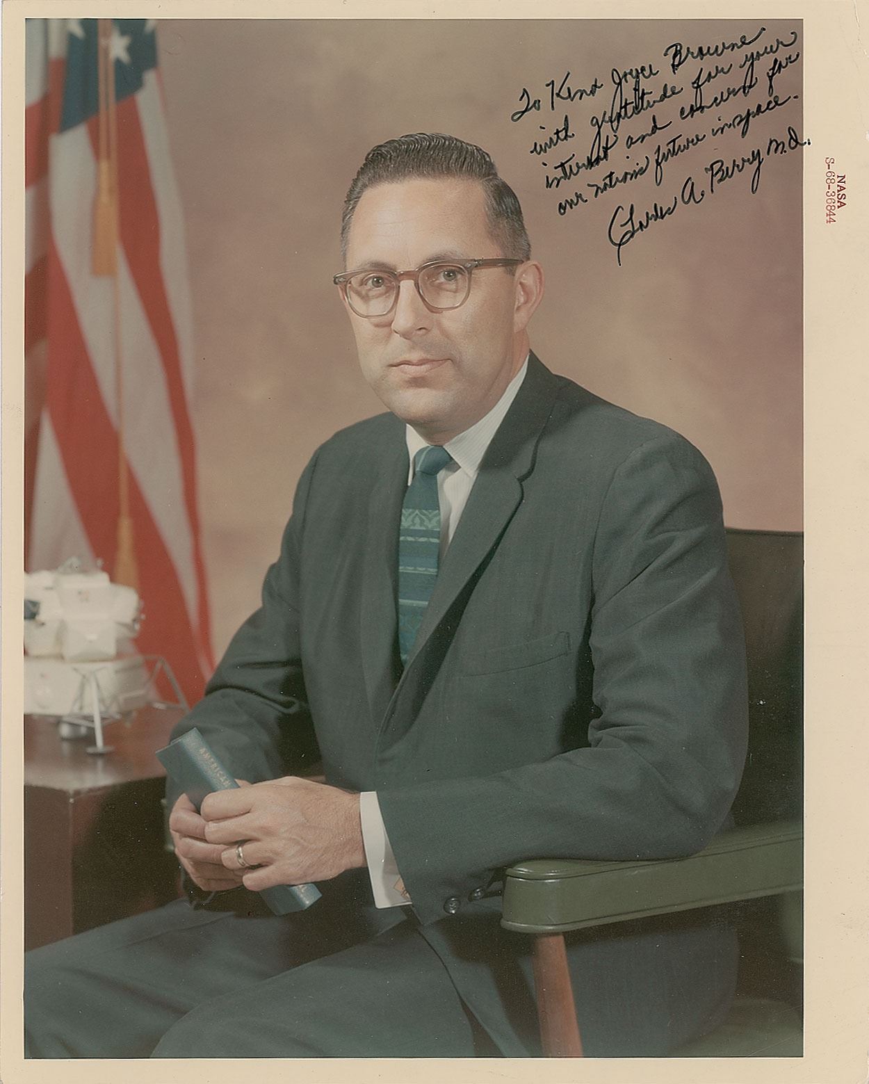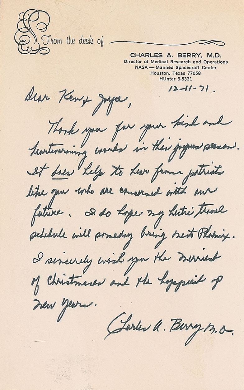 Two items: an official vintage color glossy 8 x 10 red-numbered NASA photo of Dr. Barry, signed and inscribed in black ink, "To Ken & Joyce Browne, with gratitude for your interest and concern for our nation's future in space, Charles A. Berry, M.D."; and an ALS signed "Charles A. Berry, M.D.," one page, 5 x 8, personal letterhead, December 11, 1971, in part: "Thank you for your kind and heartening words in this joyous season. It does help to hear from patriots like you who are concerned with our future." In very good to fine condition, with two paperclip impressions to the top edge of the photo.