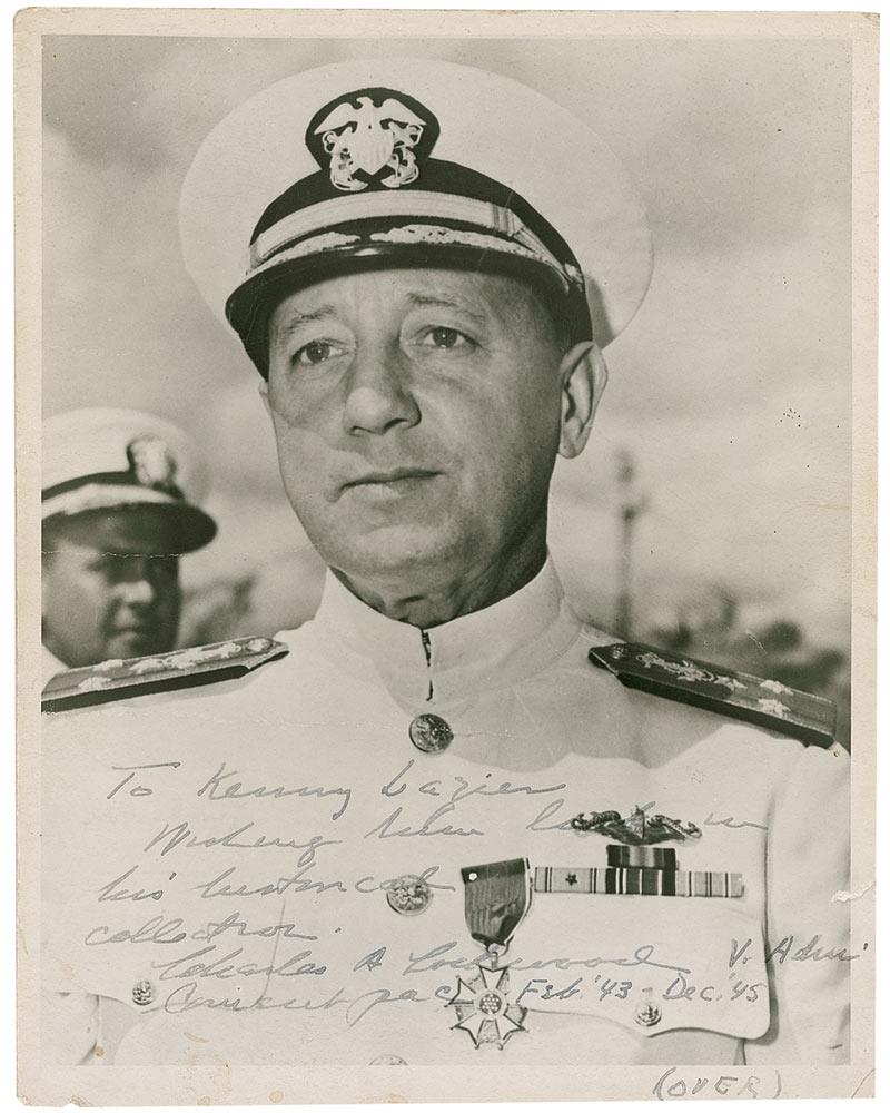 US Navy officer (1890–1967) known in submarine history as the legendary commander of Submarine Force Pacific Fleet during World War II. He devised tactics for the effective use of submarines, making the members and elements of ‘silent service’ key players in the Pacific victory. Vintage matte-finish 8 x 10 photo of Lockwood in his dress whites, signed and inscribed in fountain pen “To Kenny Lazier, Wishing him luck in his historical collection. Charles A. Lockwood, V. Adm. com sub pac.” Lockwood has added a lengthy postscript on the reverse detailing his various ribbons, signed at the conclusion “C.A.L.” Mild creasing across the image touching his face, scratches, a small tear at the left side, and scattered soiling, otherwise very good condition.