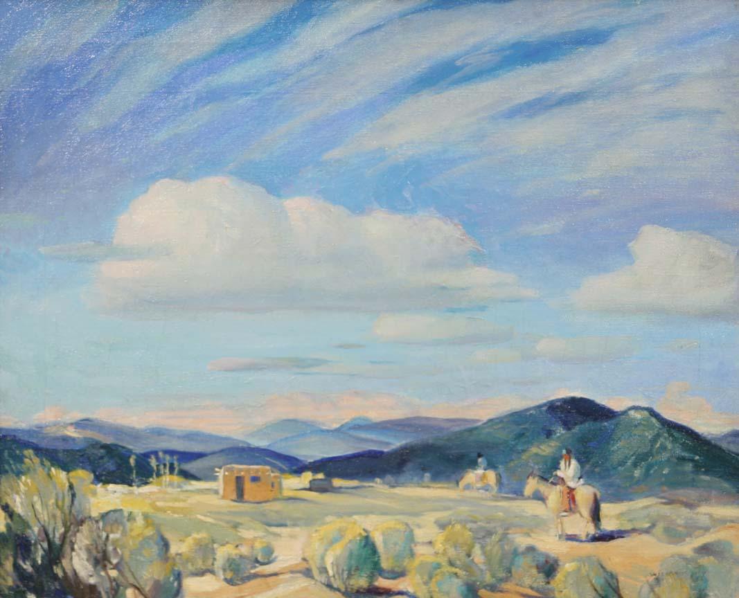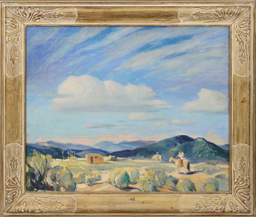 Charles A. Wilimovsky (1885-1974). Sunday Morning, New Mexico. 20" x 24" oil on canvas. Signed lower left . (est $1,000-1,500). Provenance: Wedding present from artist to niece, Nancy Anne Hartmann, in 1936. From Hartman to present owner. Chicago Galleries Association exhibition tag on back. For condition reports please visit: www.auctioninsantafe.com/cr2011.pdf