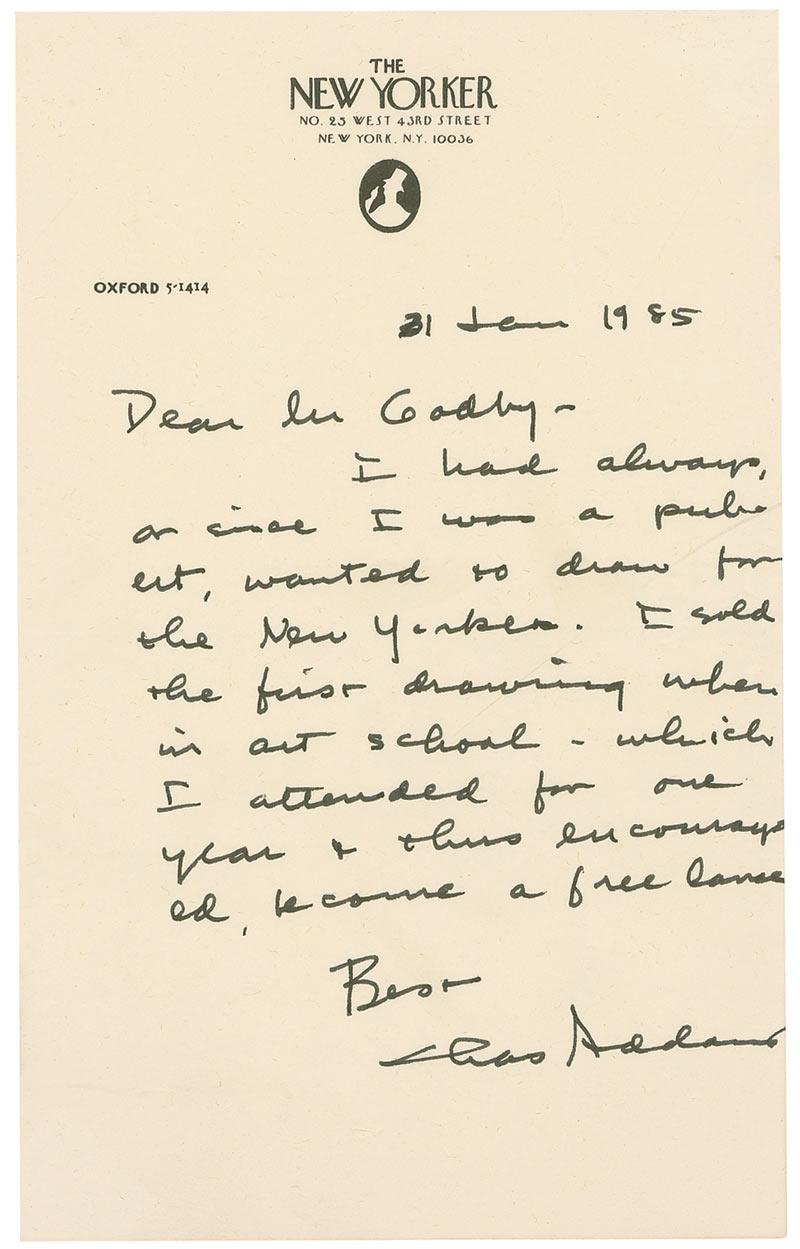 American cartoonist (1912–1988) best known for his clever, macabre sense of humor. His most famous creation was the Addams Family. ALS signed “Chas Addams,” one page, 4.5 x 7.25, The New Yorker letterhead, January 31, 1985. Addams provides a brief synopsis of his career to an admirer. In full: “I had always, or since I was a pubert, wanted to draw for the New Yorker. I sold the first drawing when in art school—which I attended for one year & thus encouraged, became a free lancer.” In fine condition, with light creasing and a central horizontal mailing fold.