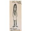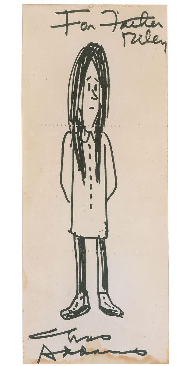 Original vintage signed and inscribed full-length felt tip sketch of Wednesday Addams on an off-white 4.25 x 11 sheet, signed and inscribed, “For Father Riley, Chas Addams.” In fine condition, with some dampstaining along bottom edge, some over portion of last name, and a thin horizontal line of ink dots through upper portion of sketch. Accompanied by the unsigned book Addams and Evil.
