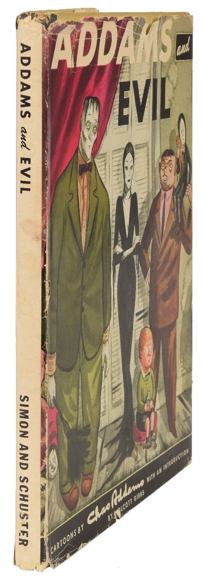 Signed book: Addams and Evil. Later printing. NY: Simon & Schuster, 1947. Hardcover with dust jacket, 8 x 11.25, 108 pages. Signed and inscribed on the first free end page in black ink, “To Adrena for Bob Guy, Chas Addams, New York 1958,” with Addams adding a great full-length sketch of Wednesday Addams. In fine condition, with some light toning to signed page, and some creasing and edge loss, slight dampstaining, and clipped inside corners of dust jacket.