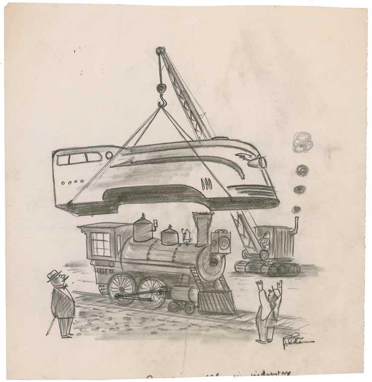 Original vintage signed pencil sketch of an old train being retrofitted as a locomotive on an off-white 11 x 11.25 sheet, signed “Chas. Addams.” In fine condition, with trimmed lower edge, a few creases and wrinkles, and some scattered light soiling. RRAuction COA.