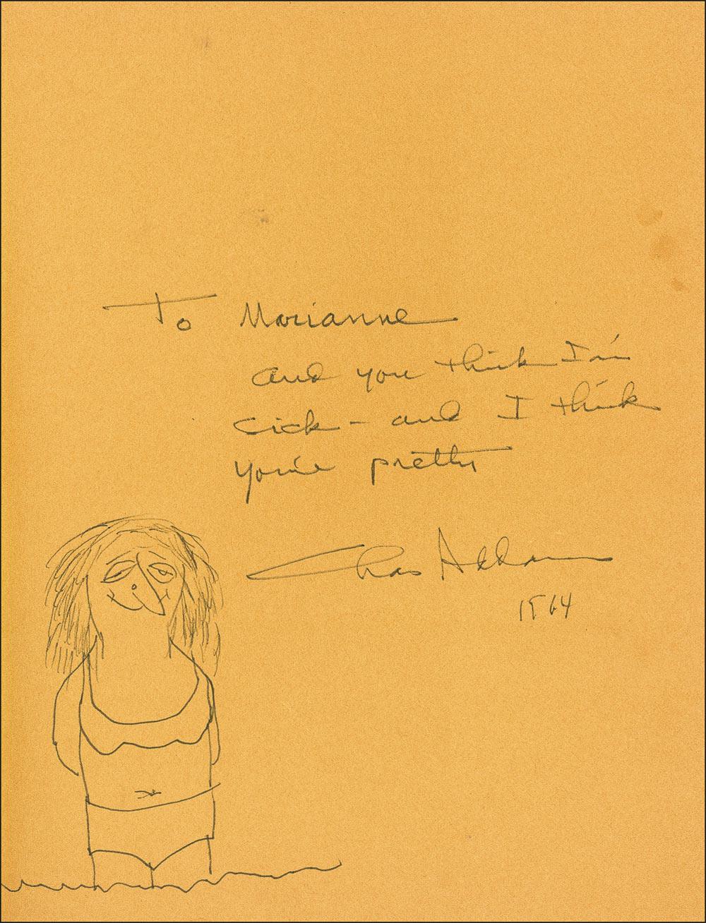 Original vintage signed pencil sketch of a witch with a mattress flung over her shoulder standing at a bank teller’s window on an off-white 7.25 x 8.25 sheet, signed “Chas. Addams.” Affixed to an identical size board. In fine condition, with scattered light creases with one horizontal crease passing through “Addams.” RRAuction COA.