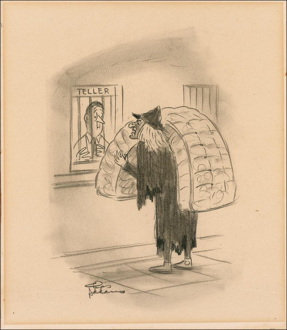 Signed book: The Groaning Board. First edition, first printing. NY: Simon and Schuster, 1964. Hardcover, 9 x 11.25, 88 pages. Signed and inscribed on the first free end page, “To Marianne, and you think I’m sick—and I think you’re pretty. Chas Addams 1964.” Next to his signature, Addams adds a sketch of a bikini-clad Grandmama Addams knee deep in water. In fine condition, with an inconsequential light stain to blank area of signed page and some minor wear to dustjacket (tiny chip to top edge of spine). Pre-certified PSA/DNA and RRAuction COA.