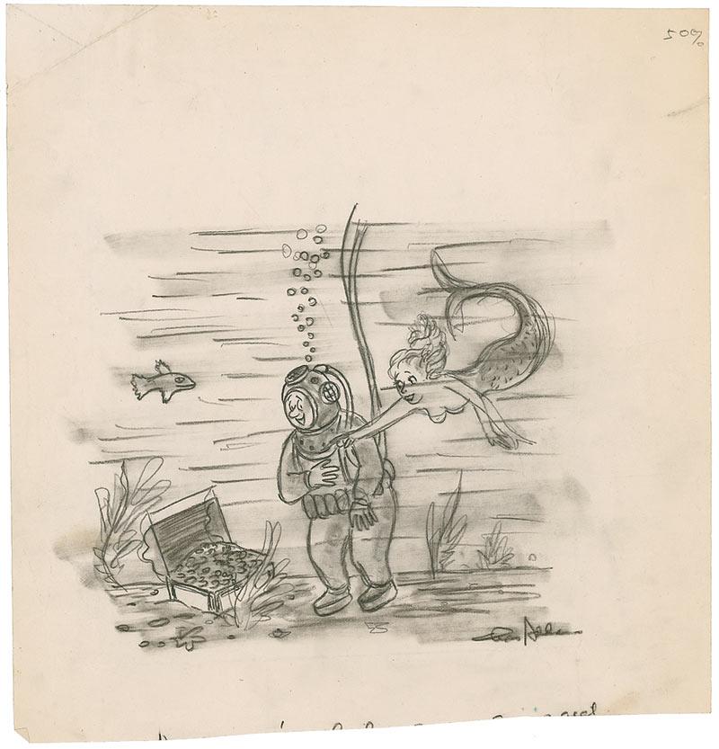 Original vintage signed pencil sketch of a deep sea diver and a mermaid discovering a treasure chest on an off-white 10.75 x 10.75 sheet, signed “Chas. Addams.” In fine condition, with scattered creases and wrinkles, and a trimmed bottom edge. RRAuction COA.