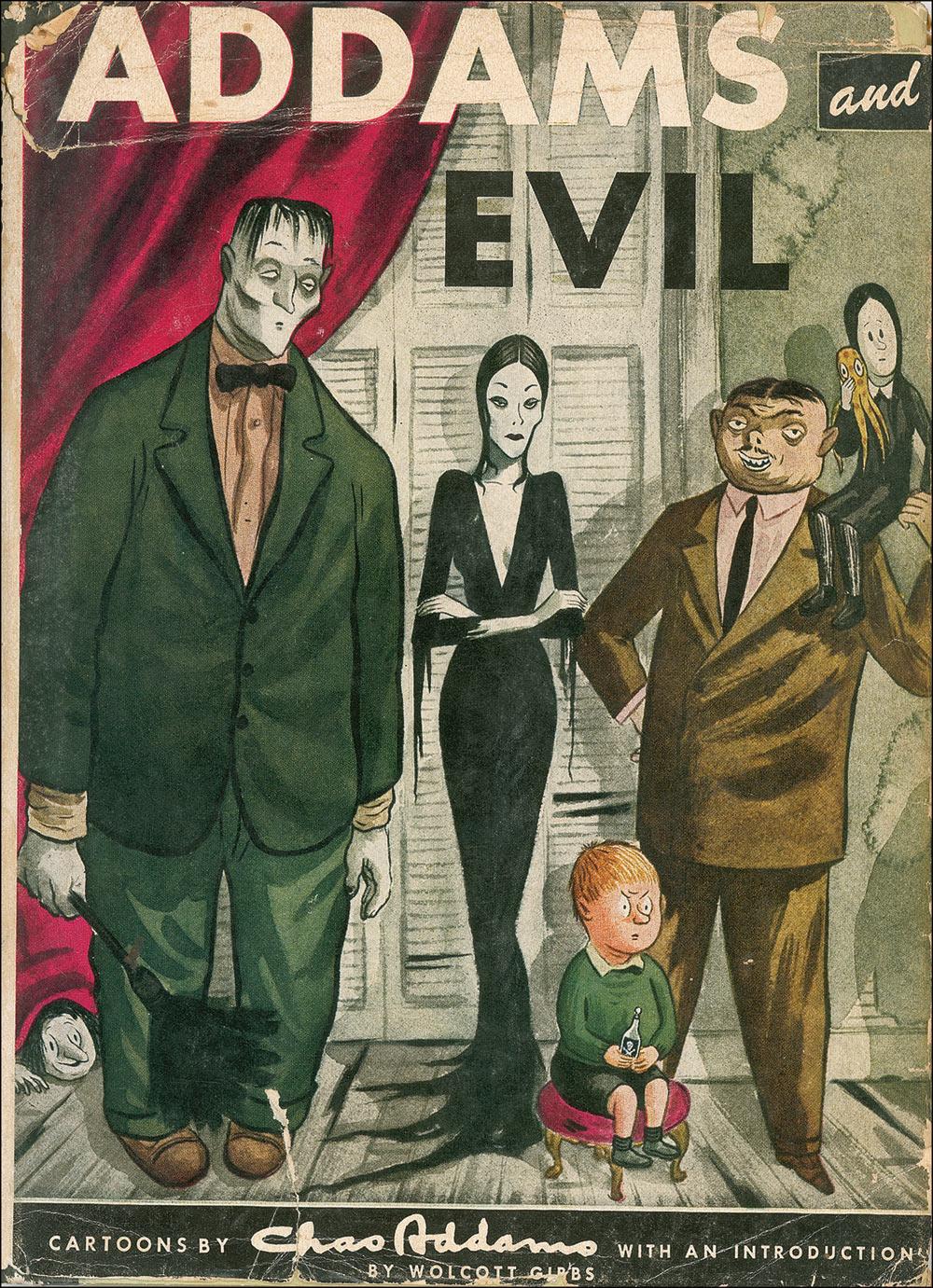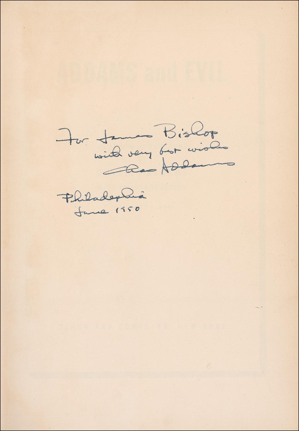 Signed book: Addams and Evil. Later printing. NY: Simon & Schuster, 1947. Hardcover with dustjacket, 8 x 11. Signed and inscribed on the first free end page, “For James Bishop, with very best wishes, Chas. Addams, Philadelphia, June 1950.” A mild overall shade of toning to signed page, as well as pastedowns, and scattered creases, wear, and edge tears to dustjacket, otherwise fine condition.