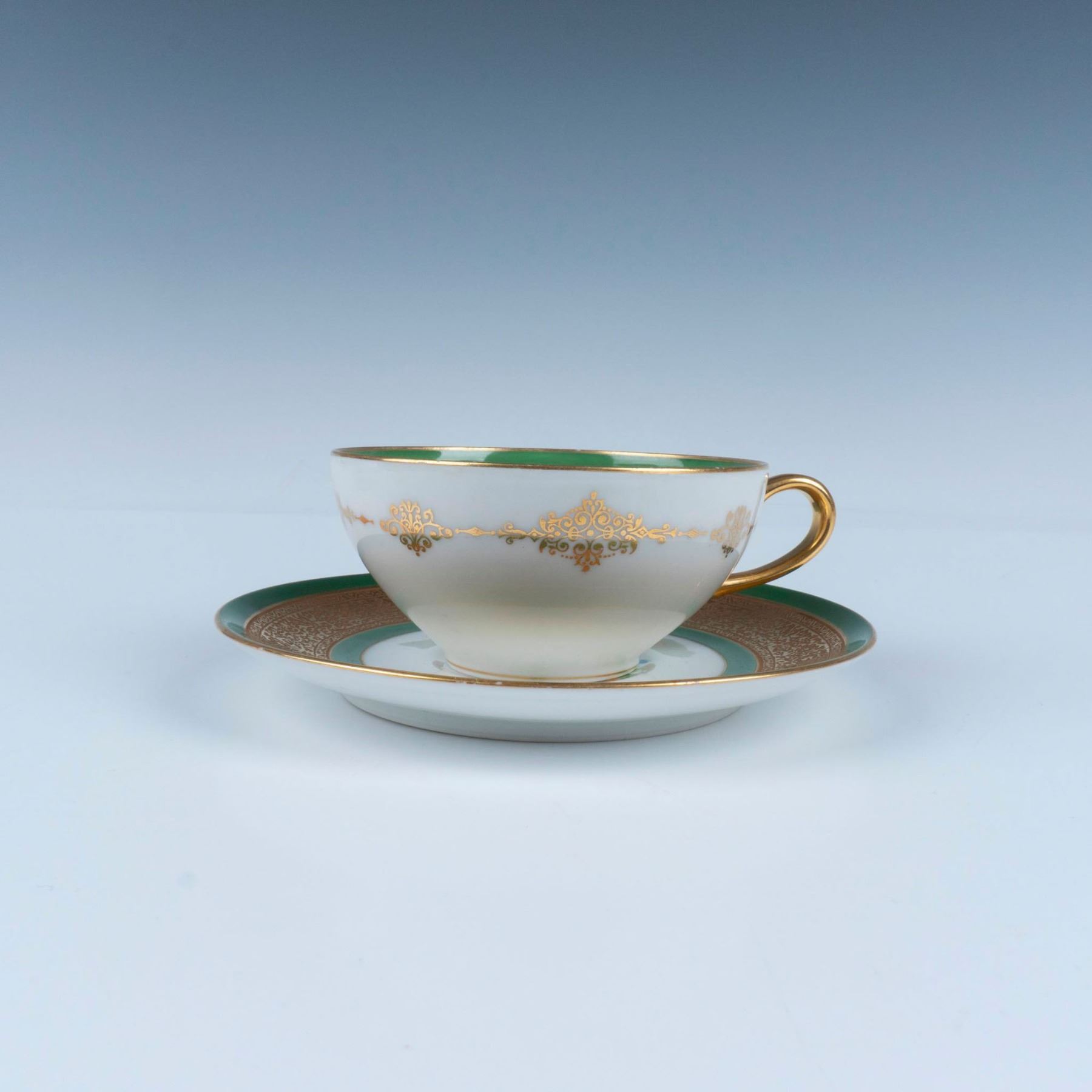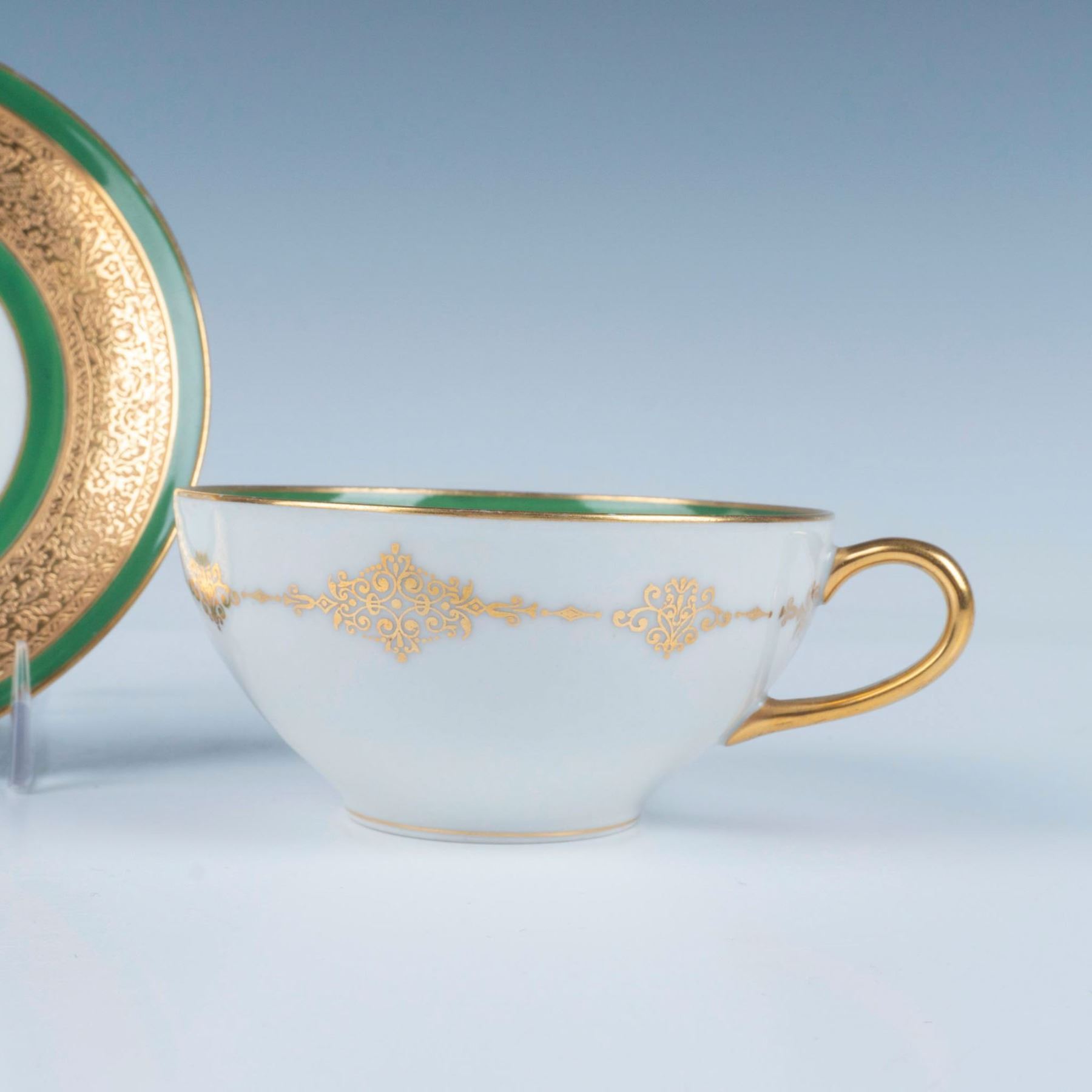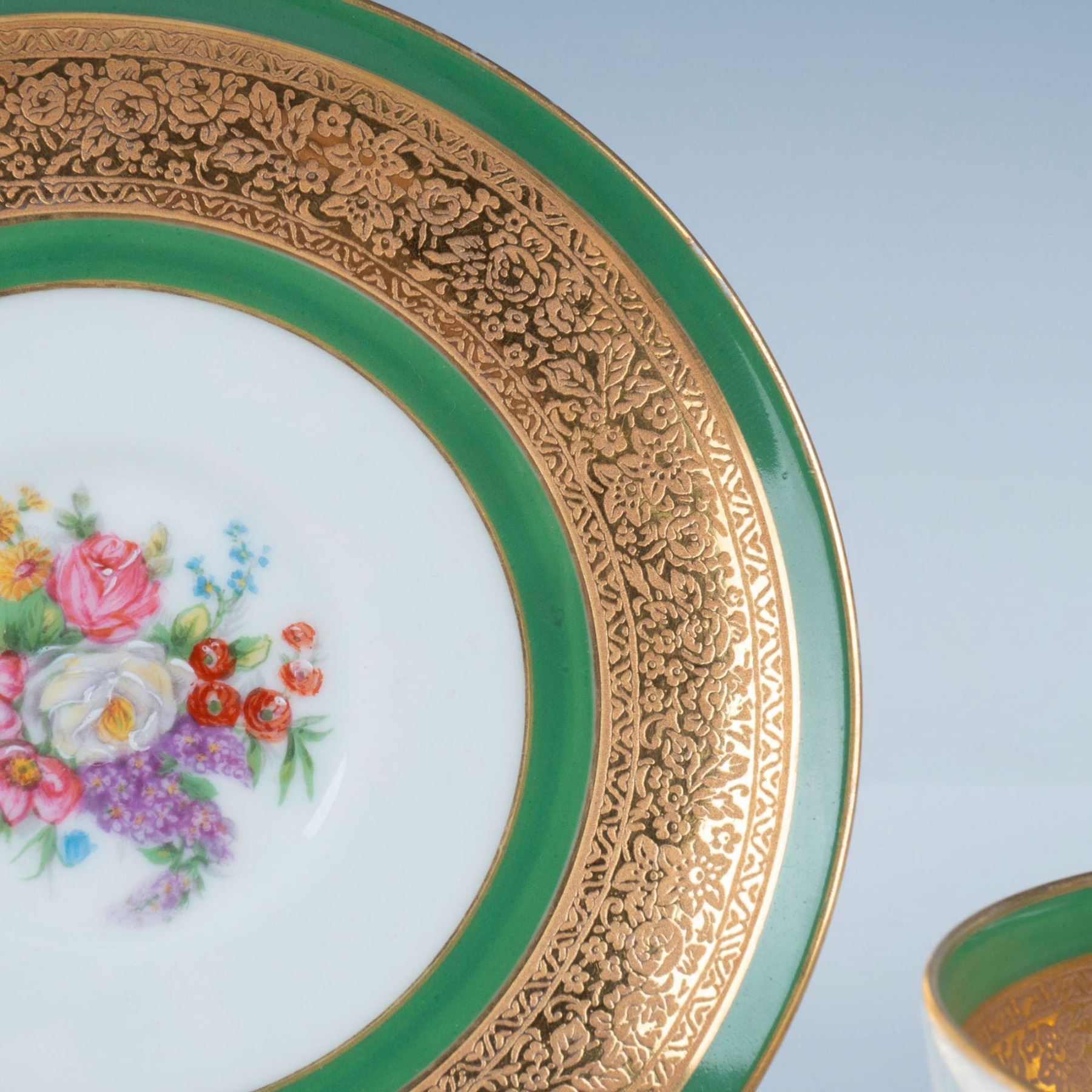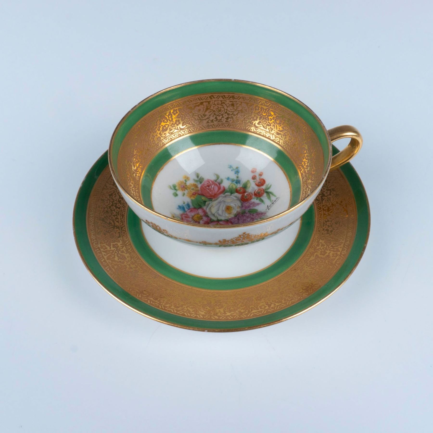 This luxurious set includes a cup with a matching saucer, both elegantly decorated with an ornate gilted floral band bordered by two green lines, featuring a beautiful hand painted flower bouquet at the center. Made expressly for Ovington's. Charles Ahrenfeldt Limoges backstamp. Artist's signature on lower right of painted flowers: Audon.