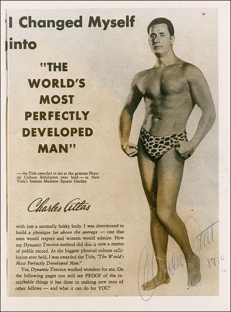 Developer of a bodybuilding method and its associated exercise program (1892-1972) that was best known for a landmark advertising campaign featuring Atlas's name and likeness. Glossy 6 x 8 photo of a Charles Atlas printed advertisement, signed in blue ballpoint, “Charles Atlas 1970.” In fine condition, with some light skipping to signature.