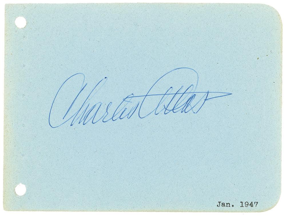 Developer of a bodybuilding method and its associated exercise program (1892-1972) that was best known for a landmark advertising campaign featuring Atlas' name and likeness. Vintage ballpoint signature, “Charles Atlas,” on a light blue 6 x 4.5 album page. In fine condition, with marginal binding holes and two punch holes to left side and a typed notation along bottom. Pre-certified Steve Grad/PSA/DNA and RRAuction COA.