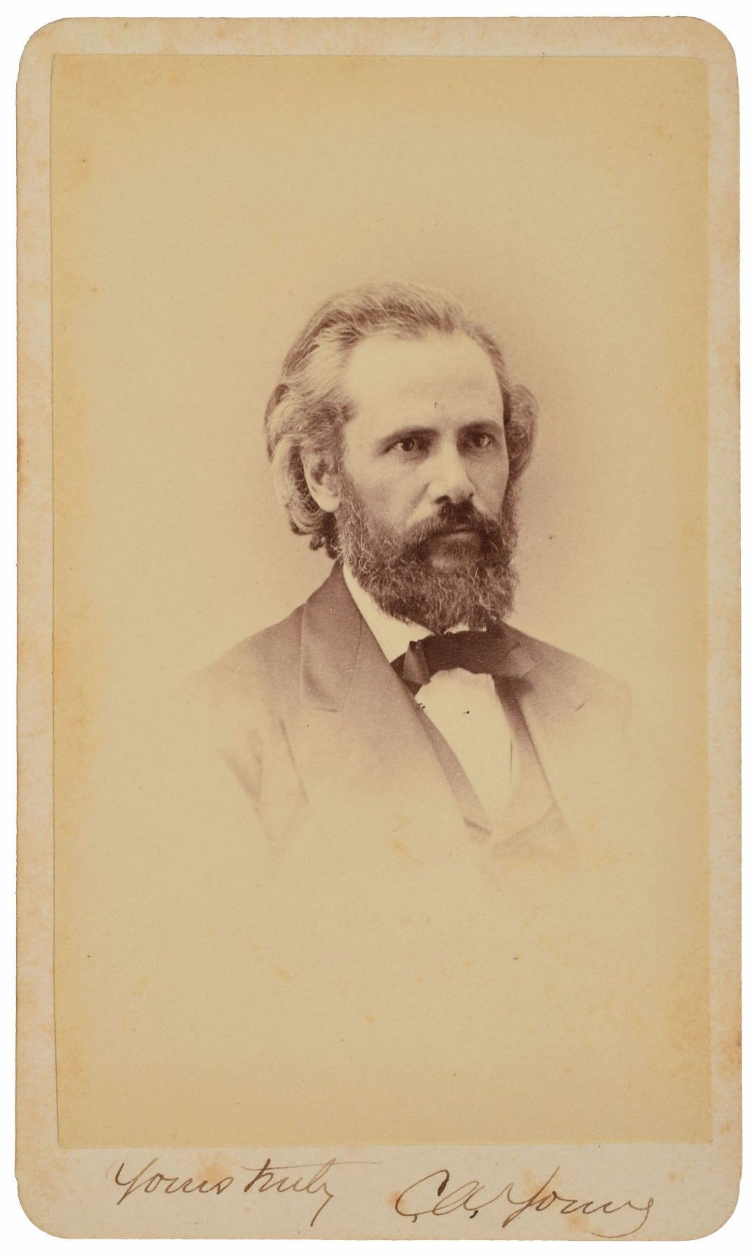 One of the foremost solar spectroscopist astronomers in the United States (1834–1908) who authored a widely used series of astronomy textbooks. Sharp 2.5 x 4 carte-de-visite portrait by Sarony & Co. of New York, signed on the mount in crisp black ink, "Yours truly, C. A. Young." In fine condition, with a bit of faint foxing.
