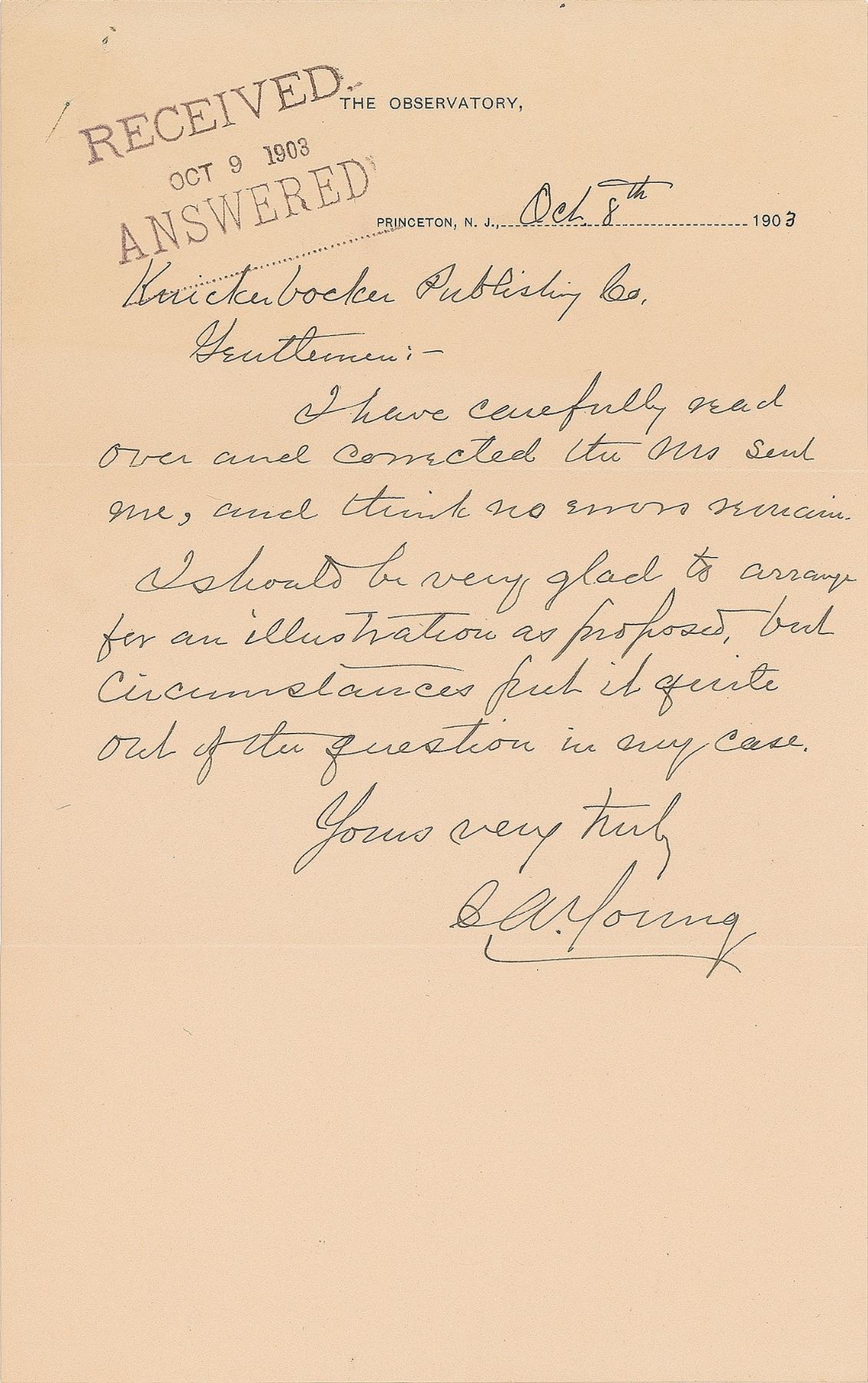 One of the foremost solar spectroscopist astronomers in the United States (1834–1908) who authored a widely used series of astronomy textbooks. ALS signed “C. A. Young,” one page, 5.75 x 9, The Observatory letterhead, October 8, 1903. Letter to Knickerbocker Publishing Co., in full: "I have carefully read over and corrected the Ms. sent me, and think no errors remain. I should be very glad to arrange for an illustration as proposed, but circumstances put it quite out of the question in any case." In fine condition.