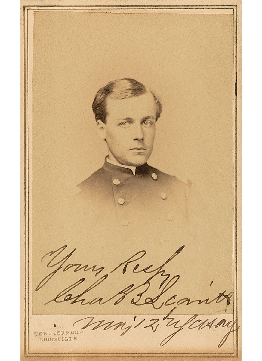 Union officer who served in the 12th USC Artillery. Original 2.25 x 4 carte-de-visite photo by Webster Brothers of Louisville, signed below the image in black ink, “Yours resp, Chas. B. Leavitt, Maj 12th U.S.C Arty.” Toning to bottom edge, light surface loss to reverse, as well as an affixed revenue stamp, otherwise fine condition.