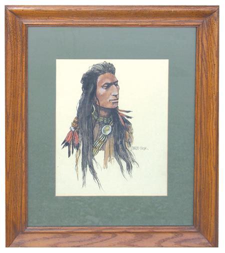Signed original pen and water color showing a warrior with dentilium and shell necklace. 13-1/2" x 10-1/2" (24-1/2" x 20-1/2" framed)