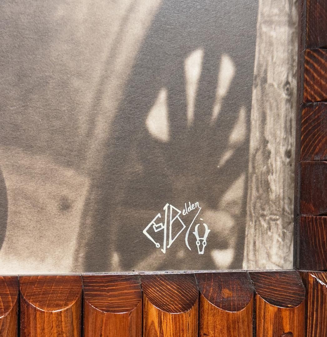 30" by 32" unframed, 35" by 37" framed. Framed in a Thomas Molesworth Frame. Provenance: Private Estate Jackson Hole Wyoming. Charles Josiah Belden (1887 - 1966) was active/lived in Wyoming, Florida, California. Charles Belden is known for Western scene photography, frontier settlement, cowboys, horses. Charles Josiah Belden (November 26, 1887 - February 1, 1966) was a photographer and rancher famous for his visceral photographs of the area around Meeteetse, Wyoming. Belden was born into a wealthy California family. His grandfather, Josiah Belden, was an early California pioneer who made millions in San Francisco real estate. Charles Belden bought his first camera to record a European tour with his school friend, Eugene Phelps. The highlight of the tour was a journey through Russia in Belden's 1908 Packard, the first automobile to make such a trip in the country. After the trip, Belden went to work as a cowboy on the Phelps (Pitchfork) Ranch in Wyoming. In 1912, Belden married Eugene's sister, Frances. The couple had three children, Annice, Margot, and Mary Elizabeth, who died while still a toddler. Eugene's father died in 1922, leaving Eugene and Charles to take over management of the Pitchfork Ranch. Airplanes became a fascination for Belden. In the late 1920s, Charles became involved in raising antelope and sending them by airplane to zoos around the world, including some to Germany in the Hindenburg. He helped to pioneer the process of planting fish from the air and filmed the experience for future reference. In addition, he helped the Wyoming Game and Fish Commission conduct a census of wildlife herd populations using aerial photographs. Estate taxes, mismanagement, and an agricultural depression that began in 1921 took their toll on the Pitchfork and the ranch fell into decline. To meet expenses, in the 1930's the family turned their home into a dude ranch, but this response did not stop the financial drain. After many years of strained relations, Charles divorced Frances in 1940 and moved to Florida with a new wife, Verna Steele Belden. Charles Belden died February 1, 1966 of a self-inflicted gunshot wound in St. Petersburg, Florida.