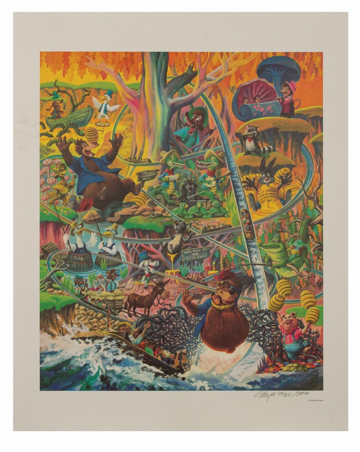 (Disneyland, 1989) A limited edition signed lithograph by Charles Boyer, created to commemorate the opening of Splash Mountain at Disneyland. The 30"x24" lithograph is titled "The Laffin' Place" and is signed by Boyer in the bottom-right corner. The lithograph is numbered 4482/5000 and is in very good condition with minor edge-wear, and a spot of handling wear along the upper left edge.