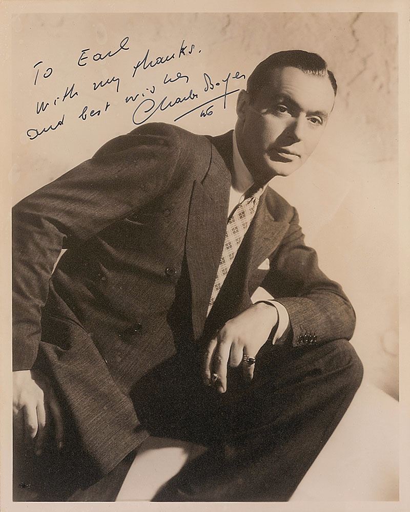 Vintage matte-finish 8 x 10 photo of the actor in a handsome suit and tie, signed and inscribed in fountain pen, "To Earl, with my thanks and best wishes, Charles Boyer, 46." In fine condition.