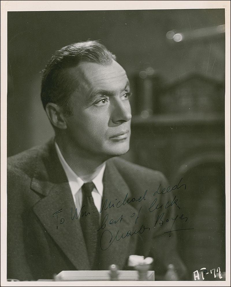 Vintage glossy 8 x 10 photo, signed and inscribed in fountain pen “To Wm. Michael Leeds, best of luck, Charles Boyer.” In very good condition, with scattered creases, surface marks, and impressions.