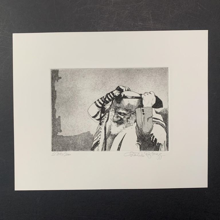 Charles Bragg's "Tefillin" limited edition print, signed lower right and numbered 286/300 lower left. This piece is of an elderly Jewish man, putting on tefillin. This piece is in excellent condition.
