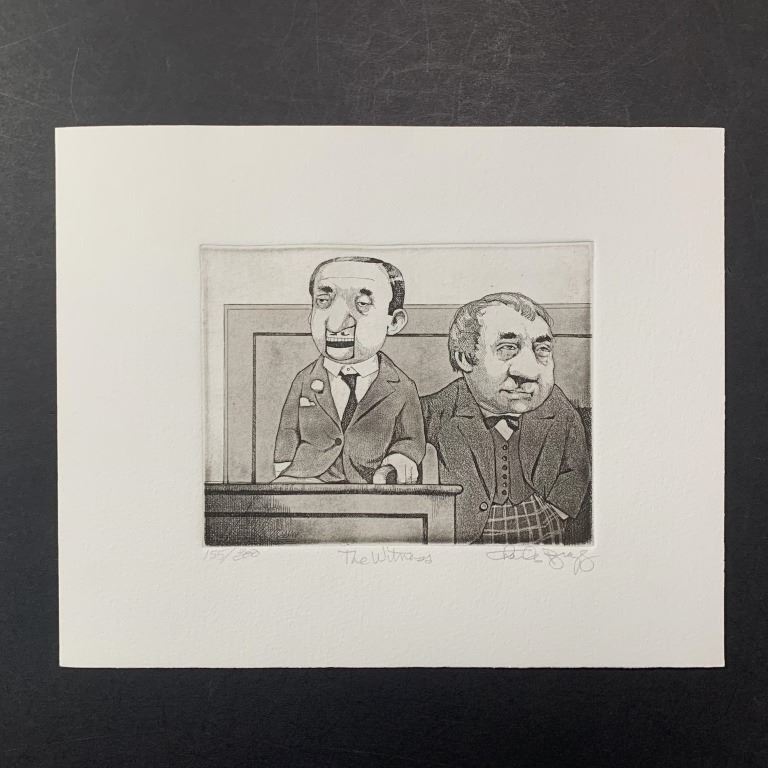 Charles Bragg's "The Witness" limited edition print, signed lower right and numbered 155/300 lower left. This piece is of a lawyer questioning a witness on the stand. This piece is in excellent condition.