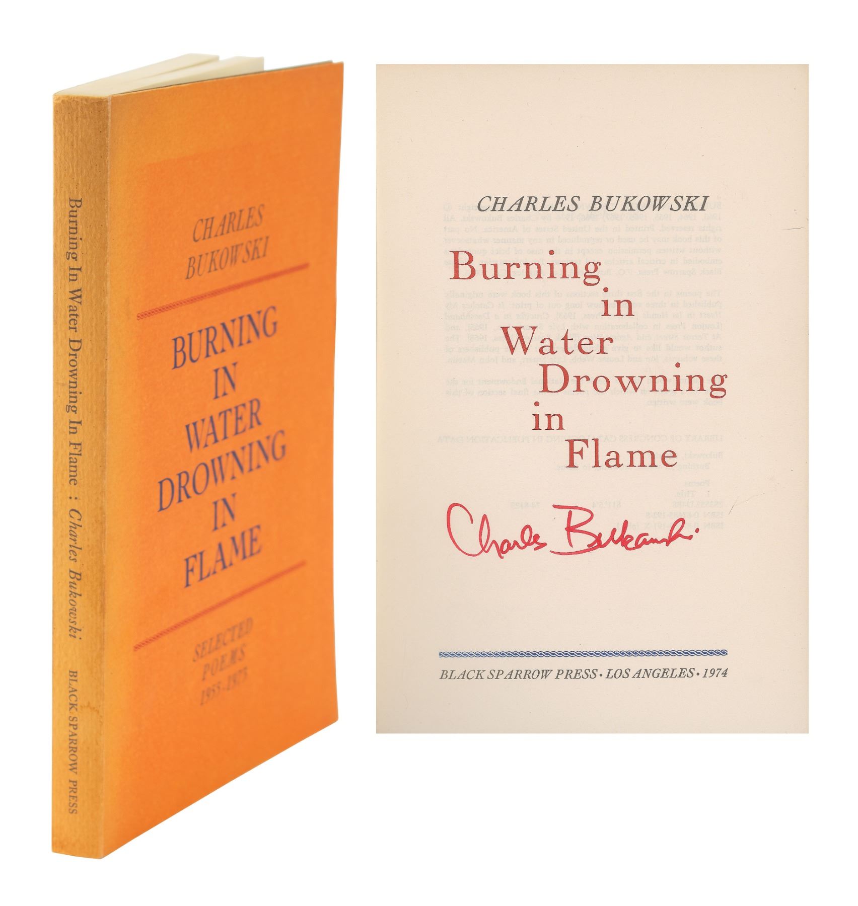 Signed book: Burning in Water Drowning in Flame. First edition. Los Angeles, CA: Black Sparrow Press, 1974. Softcover, 5.75 x 9, 232 pages. Signed on the title page in red felt tip by Charles Bukowski. Includes a postcard handwritten and signed by Patti Smith, "Patti Lee," in full: "Dear Tony—This was signed by ole Charlie. Check the title page—more coming, much love. Your harp was for the dogs (the illuminated bark)." In very good to fine condition, with sunning to spine and front wrapper. A unique association piece that makes connections across the arts.