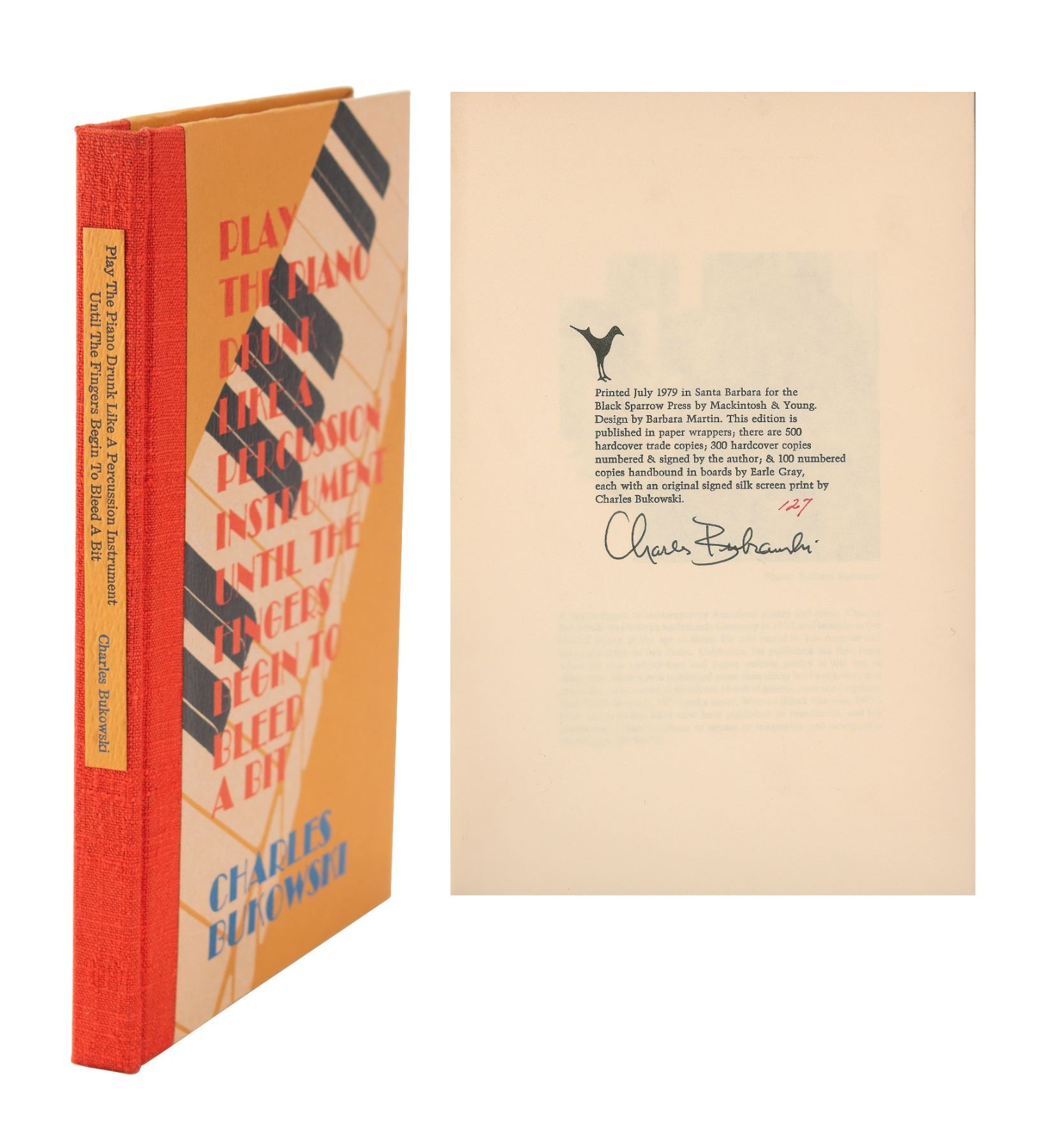 Signed book: Play the Piano Like a Percussion Instrument Until the Fingers Begin to Bleed a Bit. First edition, limited issue, numbered 127/300. Santa Barbara, CA: Black Sparrow Press, 1979. Hardcover, 6.25 x 9.25, 125 pages. Signed on the colophon in black felt tip by Charles Bukowski. In fine condition.