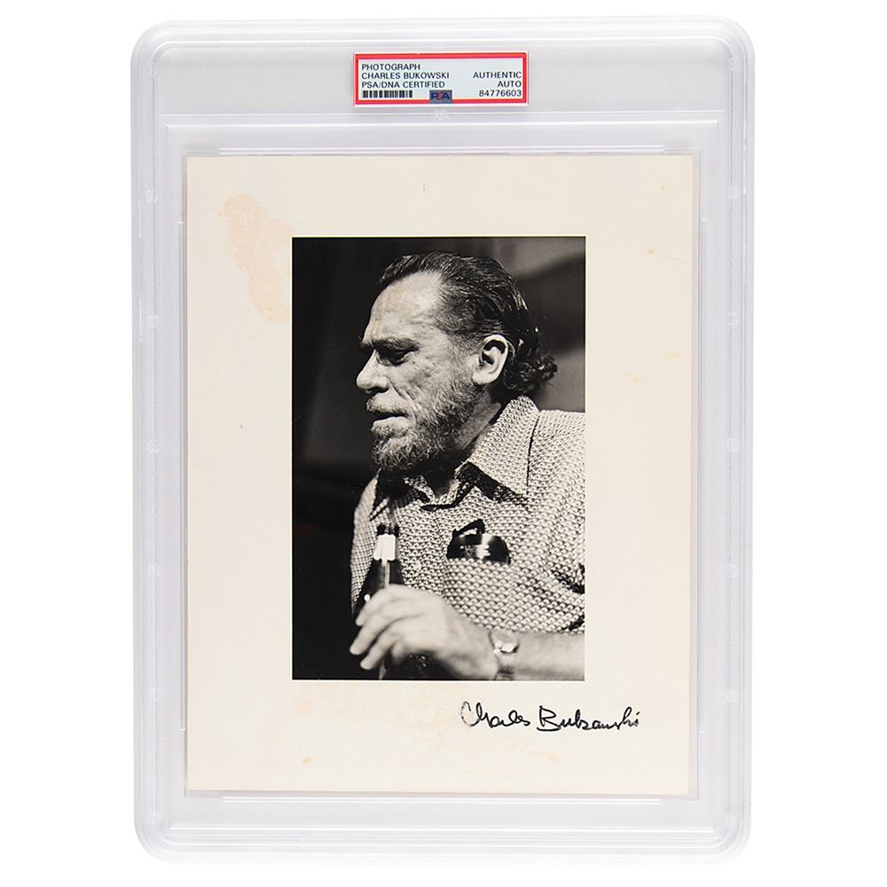 Semi-glossy 8 x 10 silver gelatin photo of Charles Bukowski holding a beer in profile, signed in the lower border in black felt tip. In very good to fine condition, with staining to the wide borders, slightly affecting the start of the signature. Encapsulated in a PSA/DNA authentication holder.