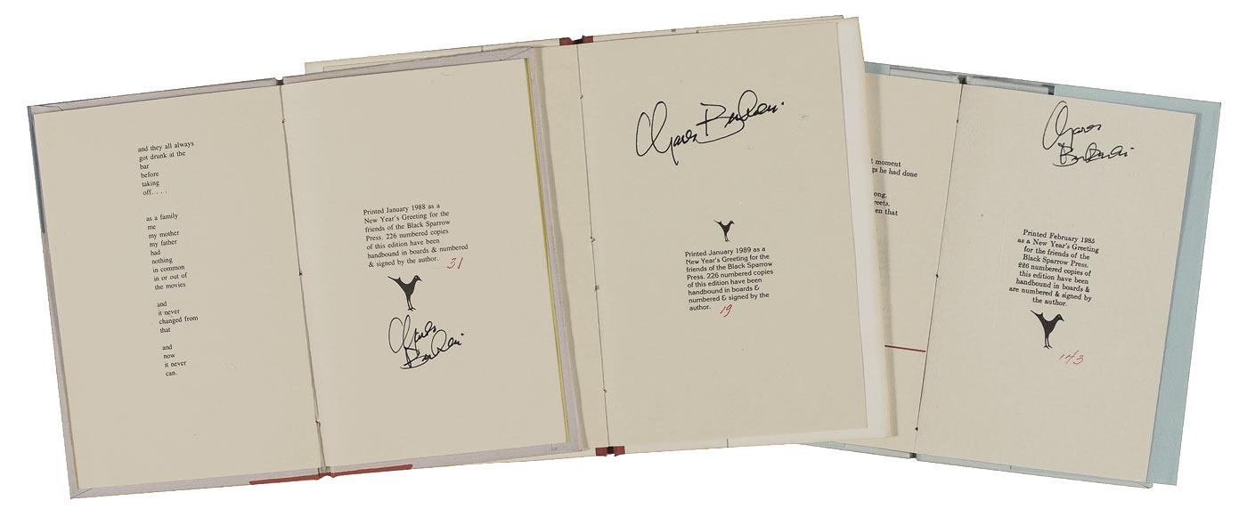 German American poet, novelist, and short story writer (1920-1994). Three limited edition books, all approximately 4.5 x 7, two hardcover and one softcover, all printed in the 1980s. Titles are: A New Year’s Greeting, Alone in a Time of Armies, and If You Let Them Kill You, They Will, each signed on the limitations page by Bukowski. In fine condition, with some light soiling to two dustjackets.