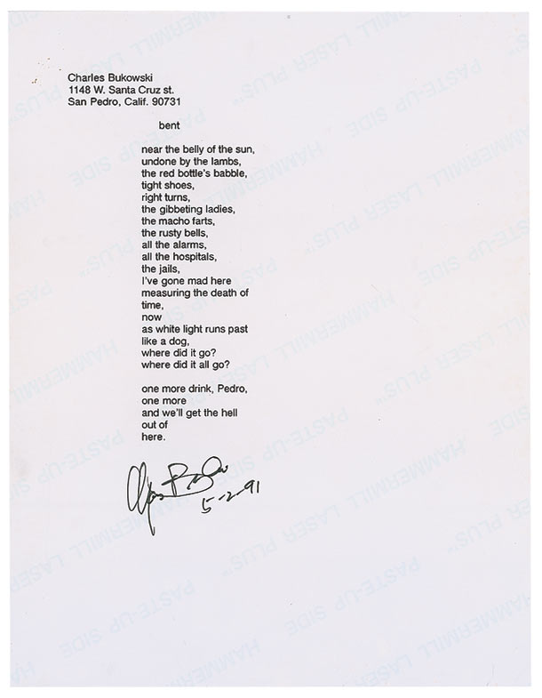German American poet, novelist, and short story writer (1920–1994). Typed Bukowski poem entitled ‘Bent,’ finally published in 2009, on an off-white 8.5 x 11 sheet, signed at the bottom, “Charles Bukowski, 5-2-91.” In fine condition. Accompanied by unsigned softcover copy of The Continual Condition.