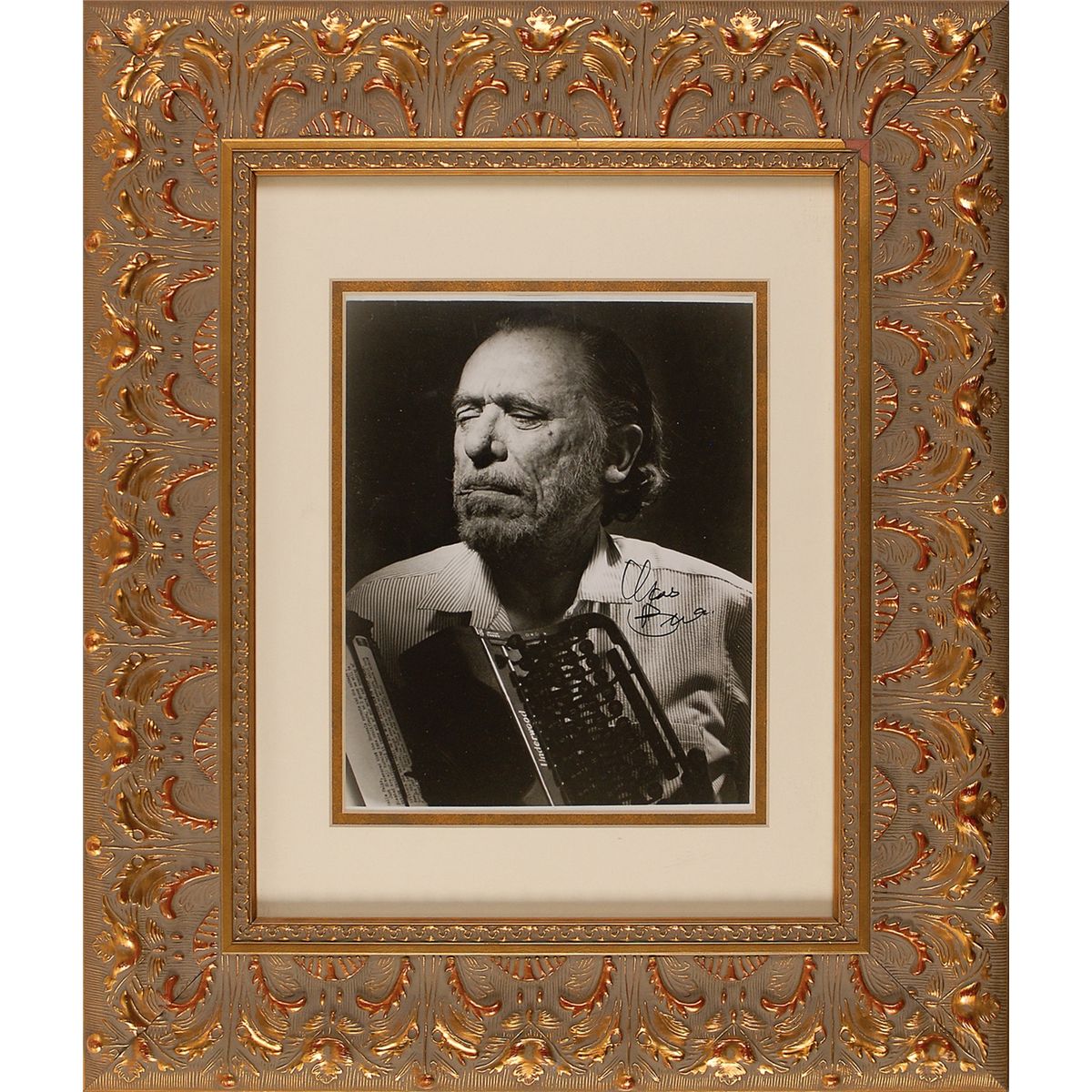 Prolific poet, novelist, and short story writer (1920–1994) known for his alcoholism, love of women, and vulgar style. Scarce glossy 7.5 x 9.5 photo of Bukowski holding his Underwood typewriter as he finishes off a joint, signed in black felt tip. Double matted and ornately framed to an overall size of 17 x 20. In fine condition, with a light crease to the lower right corner. An incredible original portrait that captures the essence of Bukowski’s life and work.