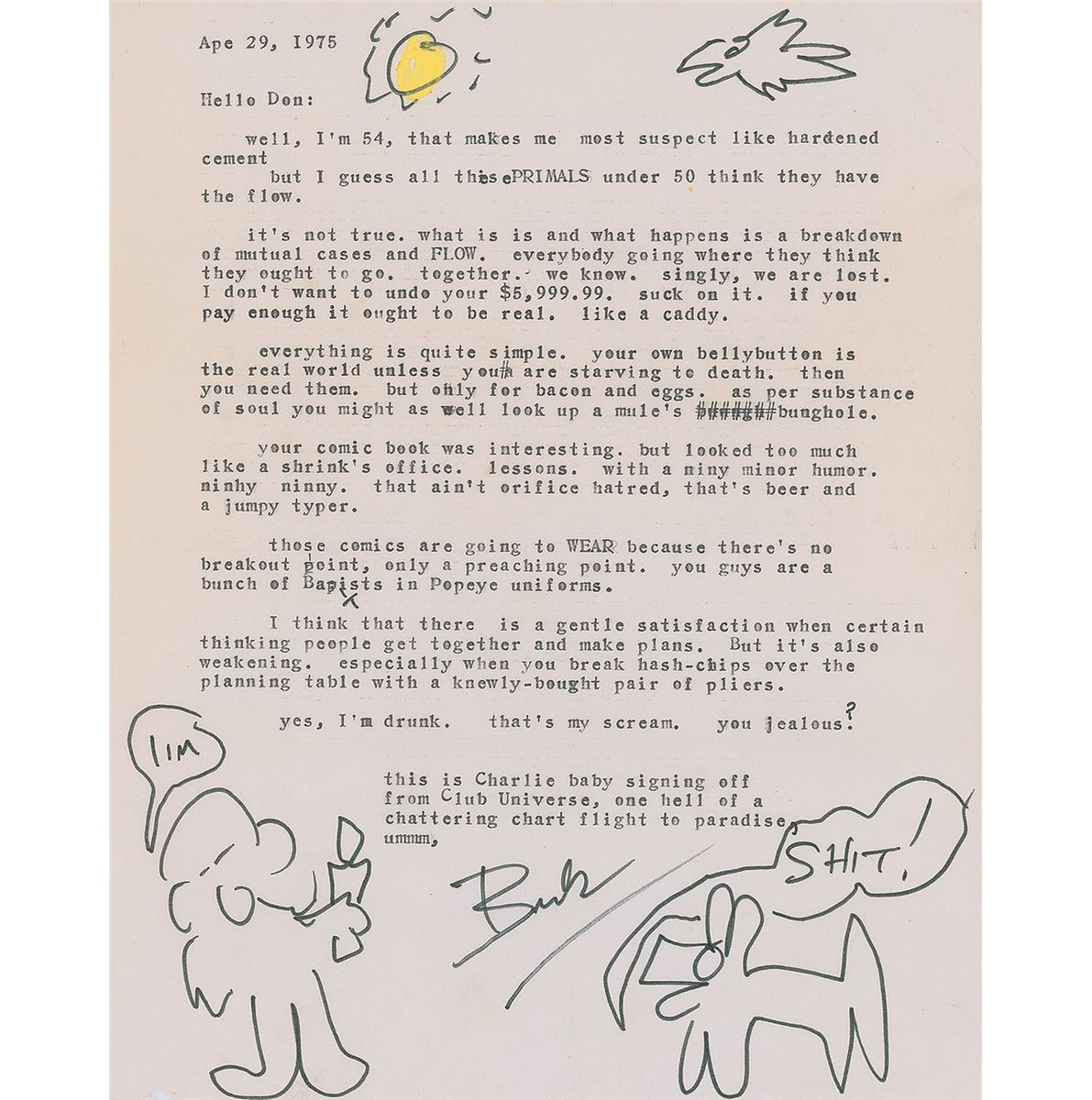 TLS signed “Buk,” one page, 8.5 x 10.5, April 29, 1975. In part (spelling and grammar retained): “everything is quite simple. your own bellybutton is the real world unless you are starving to death. then you need them. but only for bacon and eggs. as per substance of soul you might as well look up a mule’s bunghole. your comic book was interesting. but looked too much like a shrink’s office. lessons. with a niny minor humor. ninhy ninny. that ain’t orifice hatred, that’s beer and a jumpy typer. those comics are going to WEAR because there’s no breakout point, only a preaching point. you guys are a bunch of Baptists in Popeye uniforms…yes, I’m drunk. that’s my scream. you jealous? this is Charlie baby signing off from Club Universe, one hell of a chattering chart flight to paradise, ummm.” Bukowski adds several of his classic sketches, including a self-portrait caricature, a dog yelling “Shit!,” a sun, and a bird. In fine condition.