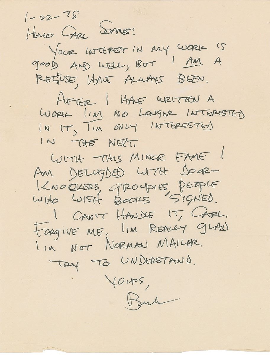 Uncommon ALS signed “Buk,” one page, 8.5 x 11, January 22, 1978. Letter to Carl Soares, in full: “Your interest in my work is good and well, but I am a recluse, have always been. After I have written a work I’m no longer interested in it, I’m only interested in the next. With this minor fame I am delugded [sic] with door-knockers, groupies, people who wish books signed. I can’t handle it, Carl. Forgive me. I’m really glad I’m not Norman Mailer. Try to understand.” In fine condition, with a crease near the bottom edge. Accompanied by the original mailing envelope, addressed in Bukowski’s own hand.