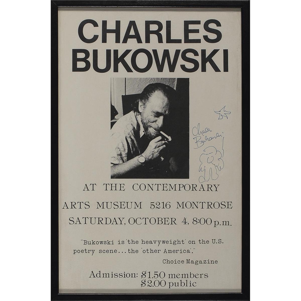 German American poet, novelist, and short story writer (1920-1994). Promotional poster advertising an appearance at the Contemporary Arts Museum, 10.75 x 16.75, signed in blue felt tip, “Charles Bukowski,” who has added two small sketches. Framed to an overall size of 11.75 x 17.75. In fine condition.