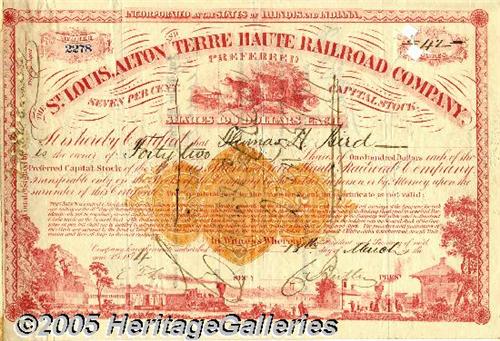 <B>Charles Butler St. Louis, Alton and Terre Haute Railroad Autographed Stock, 1874</B></I> Signed by Charles Butler, born 1802, died 1897. Lawyer, philanthropist, railroad executive. He started as a clerk at $100 a year in the office of Martin Van Buren at Albany. In 1833 Butler made a journey to the West "attended with great privations and difficulty." His hard work and shrewd political manipulation brought him great wealth and success. Biographical information is included. The color, extraordinary graphics and imprinted revenue are so exciting. Usual cancellations. Very fine condition and nicer than normally found. Rare. <I>Accompanied by COA from PSA/DNA.</B></I>
