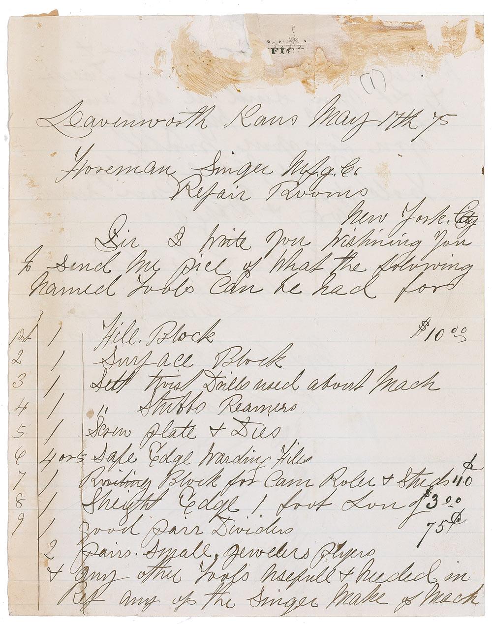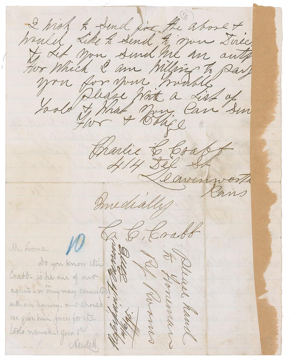 Union solider (1848–1920) considered the youngest drummer boy of the Civil War who claimed to have invented wirely telegraphy in 1883. ALS signed “Charlie C. Crabb,” one page, lightly-lined both sides, 7.75 x 9.75, May 17, 1875. Crabb contacts a New York company with a ‘wish list’ of items. In part: “I write you wishing you to send me price of what the following named tools can be had for…I wish to send for the above…for which I am willing to pay you for your trouble.” Intersecting folds, vertical folds through single letters, wrinkling, show-through from a strip of adhesive paper on the reverse (affecting several words of text), scattered staining, moderate glue residue at the top of the first page, and clear tape repair to a tear and missing paper at the top of the page, otherwise very good condition.