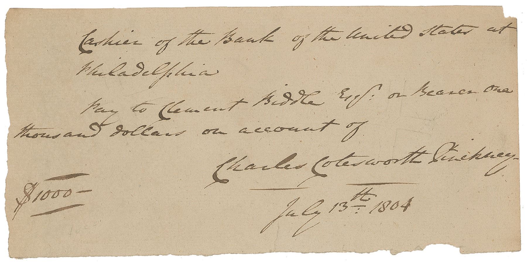 ADS signed "Charles Cotesworth Pinckney," one page, 7.75 x 3.75, July 13, 1804. Handwritten pay order issued to the "Cashier of the Bank of the United States at Philadelphia," directing a payment to Clement Biddle a total of $1000 "on account of Charles Cotesworth Pinckney." In fine condition.