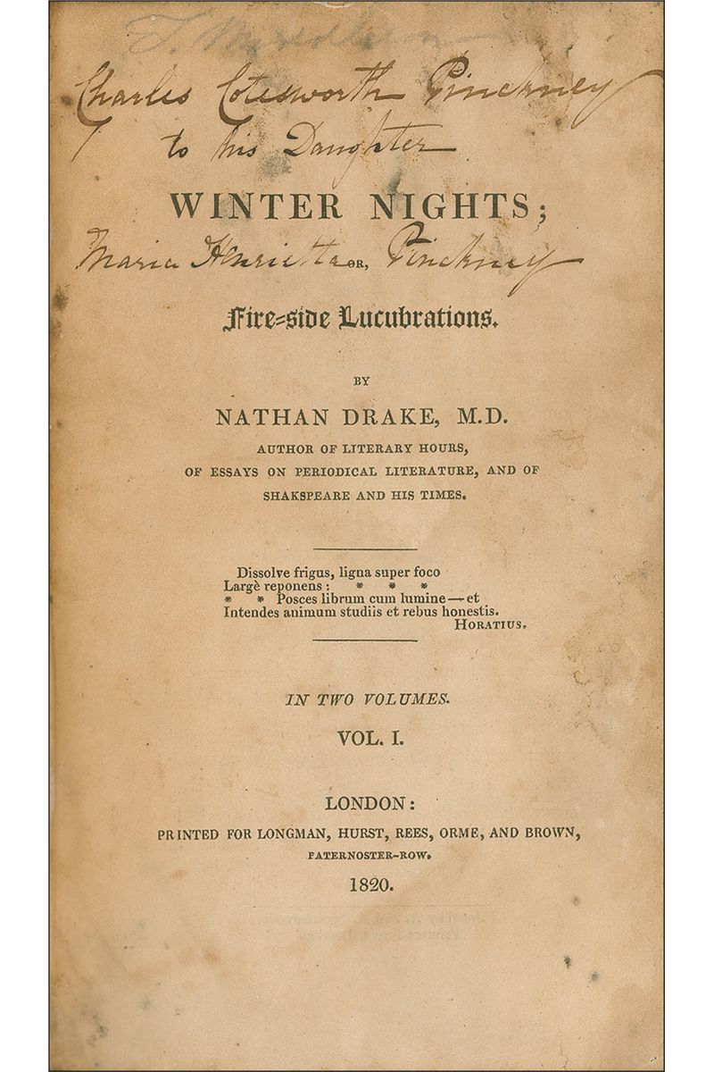 Signer of the US Constitution from South Carolina and a South Carolina governor, senator, and representative. Signed book: Winter Nights; Fire-Side Lubrications Volume I. London: Longman, Hurst, Rees, Orme, and Brown, 1820. Professionally rebound hardcover, 4.5 x 7.25, 295 pages. Signed and inscribed to his daughter on the title page, “Charles Cotesworth Pinckney to his daughter Maria Henrietta Pinckney.” In fair condition, with moderate soiling and toning to all pages, and damp staining to inside pages.