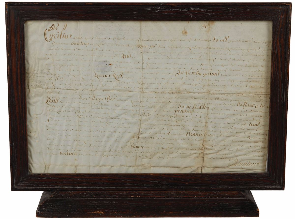 The third baron of Baltimore (1637–1715) who inherited the colony in 1675 upon the death of his father, Cecil Calvert; he served as the governor of Maryland from 1661–1676. Scarce manuscript DS, one page both sides, 13.5 x 8.5, June 10, 1671. Document relating to a land transaction, in part: “Caecilius, Absolute Lord and Proprietary of the Provinces of Maryland and Avalon Lord Baron of Baltimore to all persons to whom these presents shall come Greeting in our Lord God Everlasting…to William Keene of the province of Calvert…and Ann his wife…do hereby grant unto him the said William Keene…property containing 50 acres in West St. Mary’s manor, St. Mary’s Co., Md., in the woods adjoining Thomas Courtney’s tract of land…called ‘Keene’s rest.’” Signed in the lower right corner by Calvert. Reverse bears additional docketing relating to the land purchase, and is signed by witnesses Thomas Courtney and Robert Ellys, and by William Keene and office clerk Robert Ridgely. Housed within a standing 15.5 x 11.75 frame, with a window on the reverse for viewing the opposite side. In very good condition, with intersecting folds, and moderately heavy rippling to the vellum. Early Maryland colonial documents signed by Calvert are exceedingly rare, with this being the first such example we have ever offered.