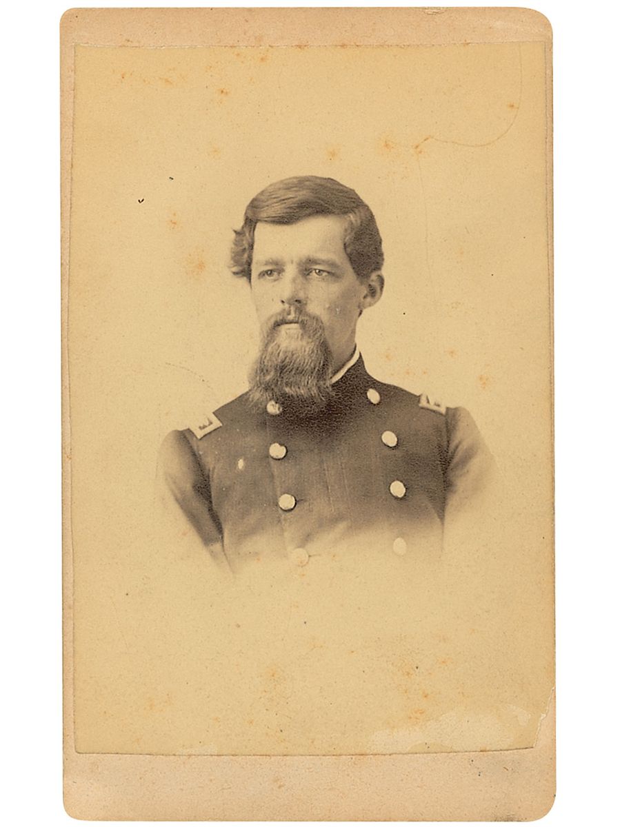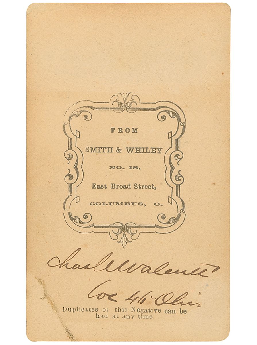Twice-wounded Union general (1838–1898). Original 2.5 x 4 carte-de-visite portrait of Walcutt in uniform by Smith & Whiley of Columbus, Ohio, signed on the reverse in black ink, “Chas. C. Walcutt, Col 46 Ohio.” Light scattered foxing and soiling, otherwise fine condition.